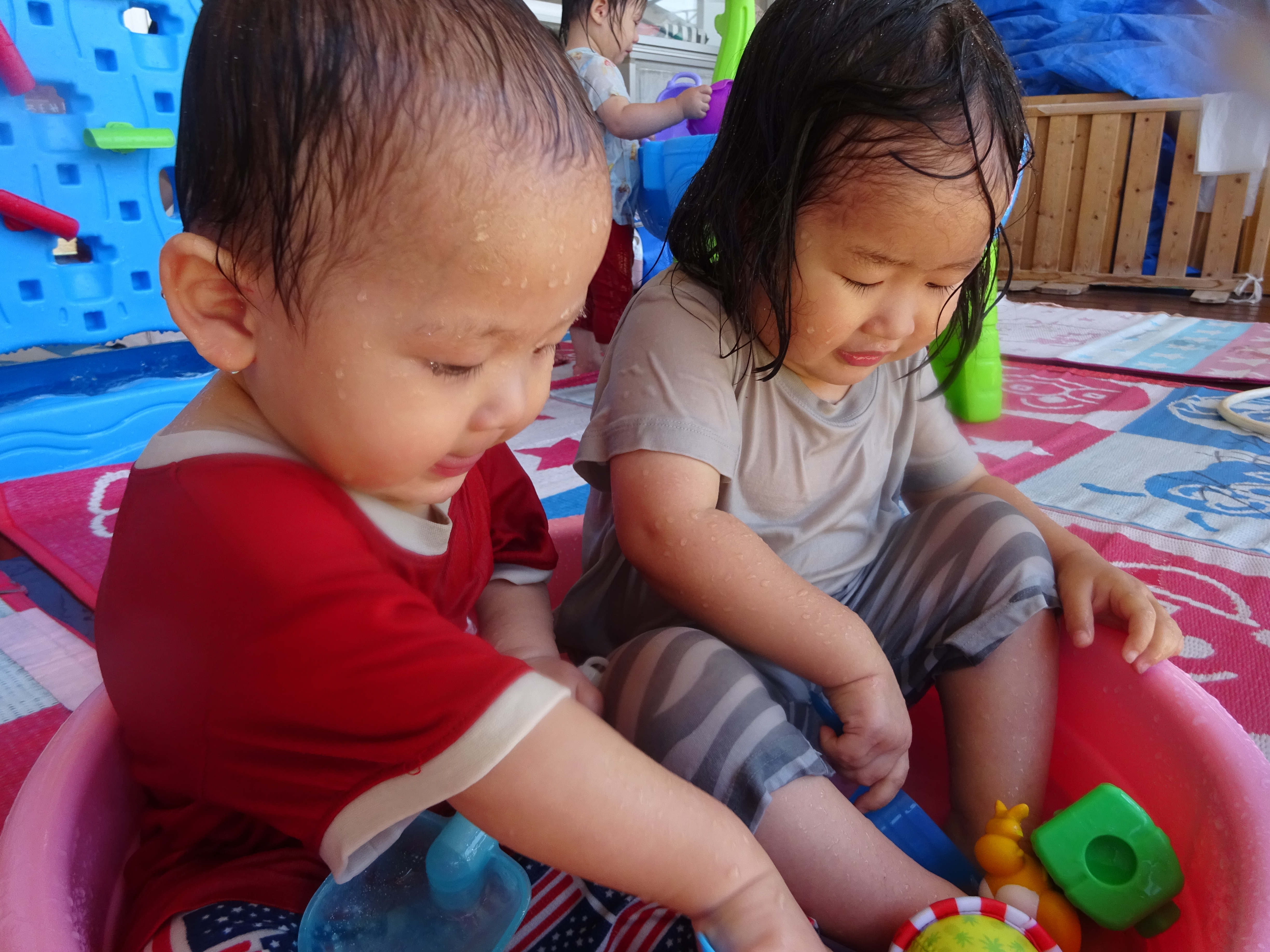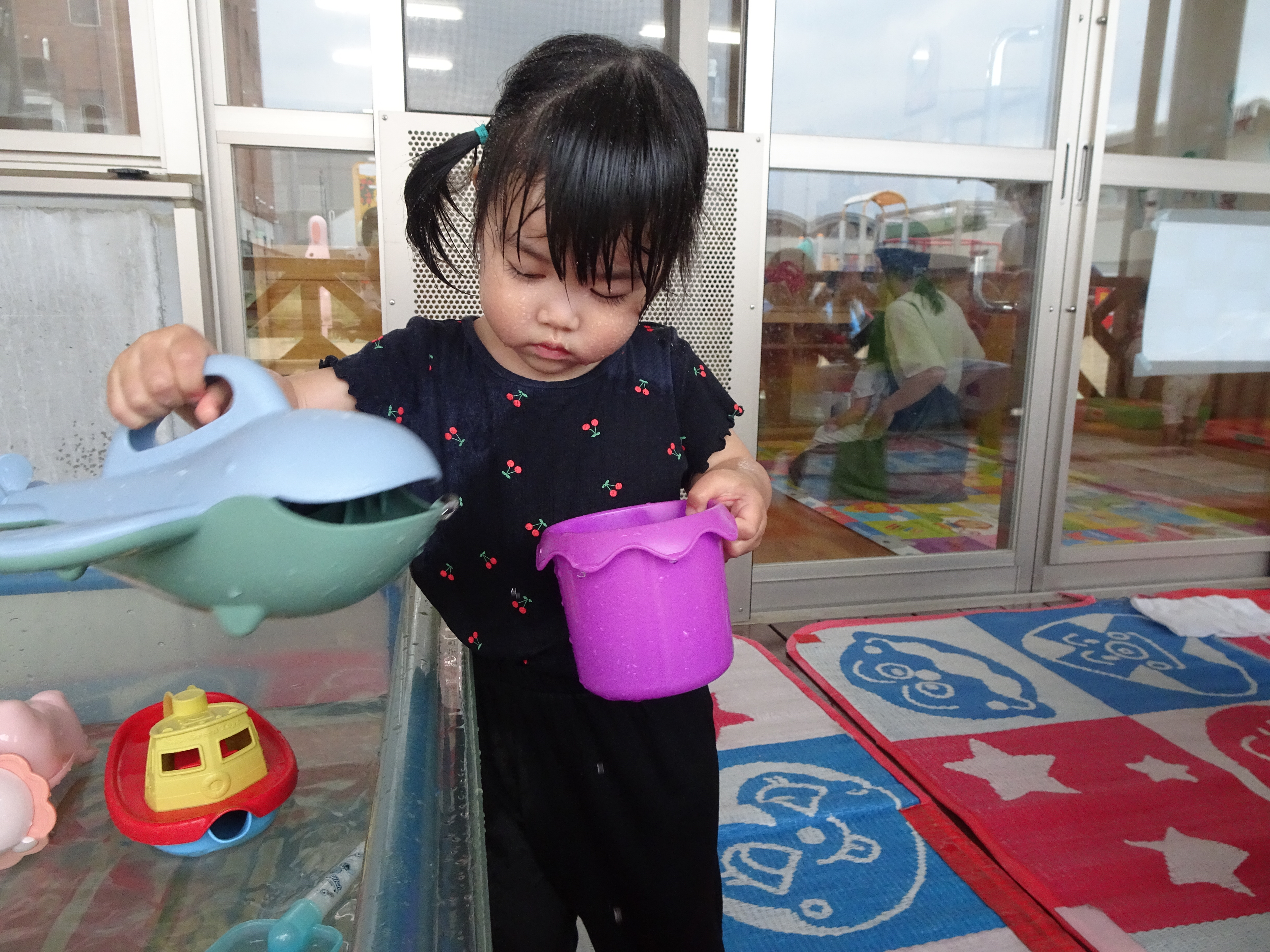今日は水遊びに園庭にとお外でたっぷり遊ぶことができました^^ まずは水遊びの様子から☝ I先生が隙間...