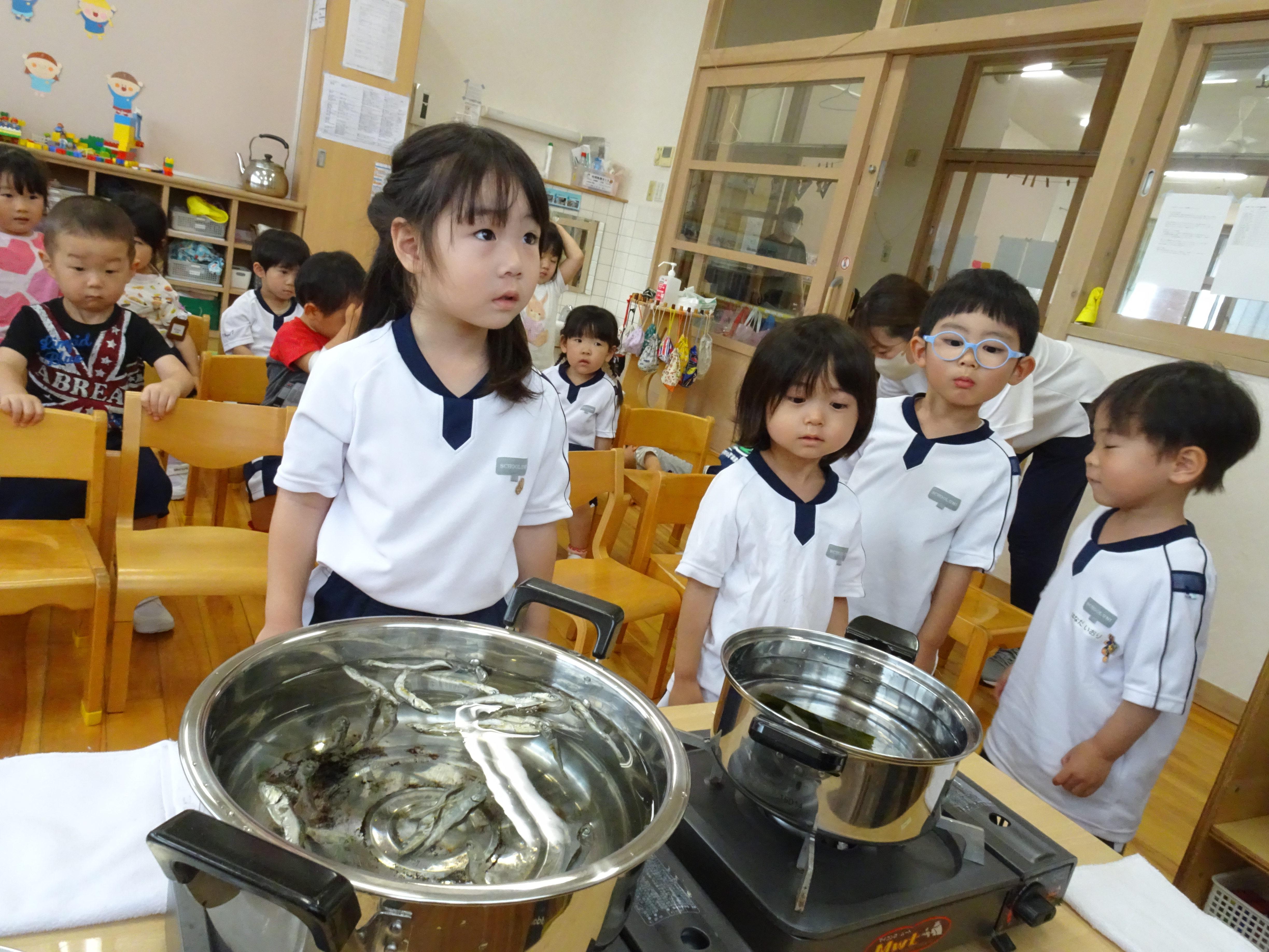 出汁って何からできてるの? 絵本を見て 昆布と煮干しからとれると知ったみんなは実際に触って匂いも...