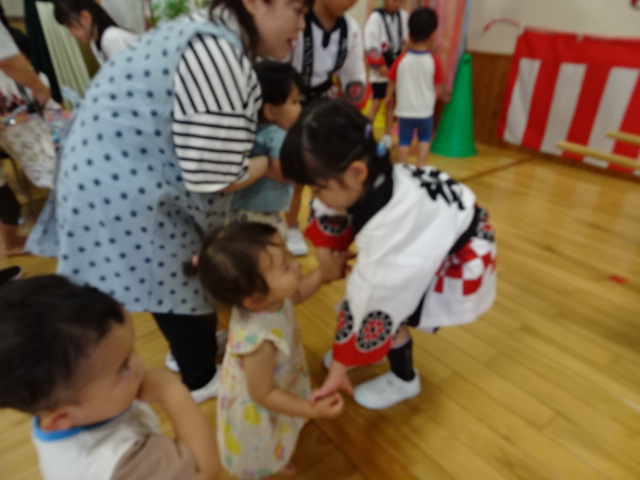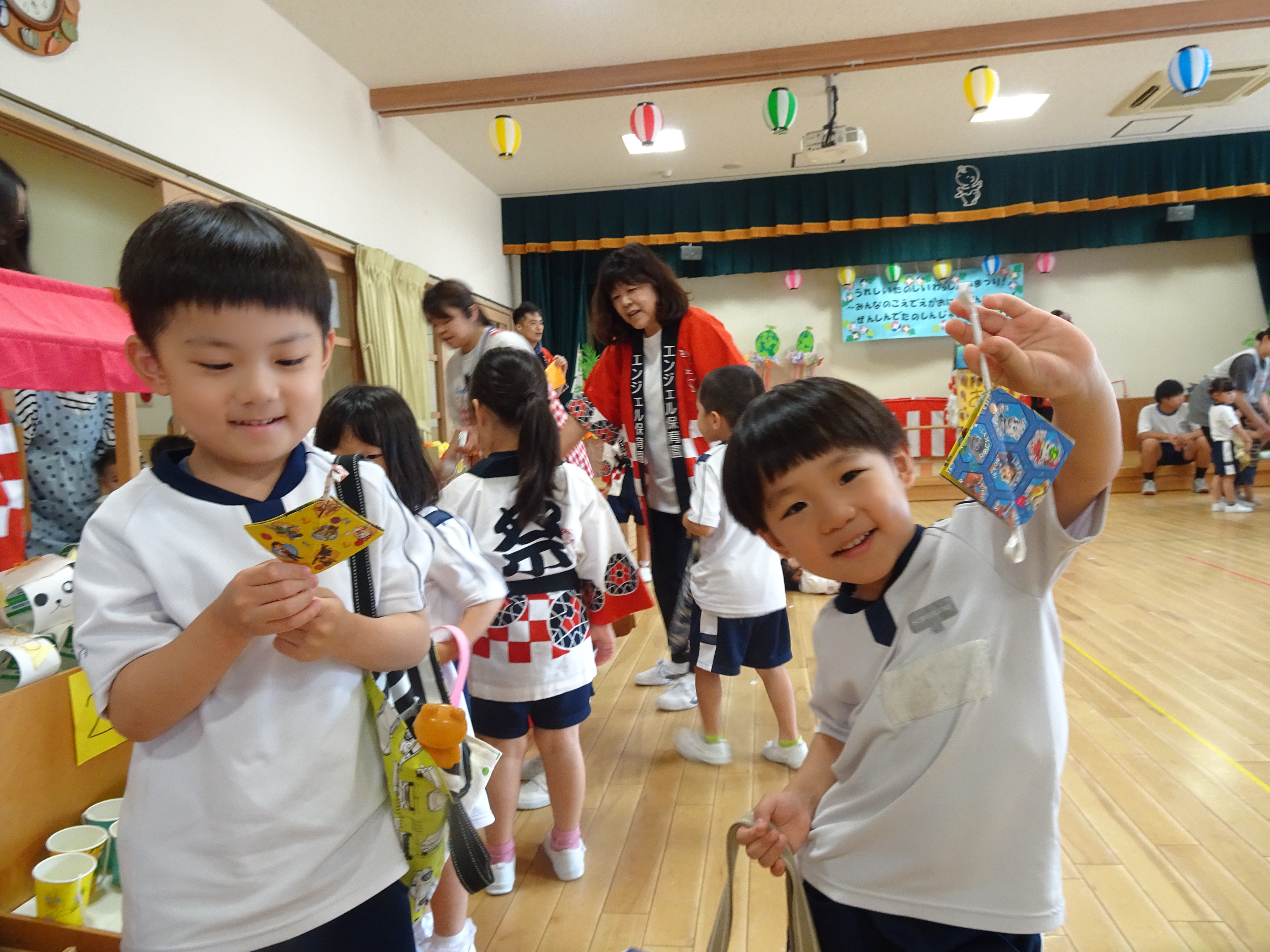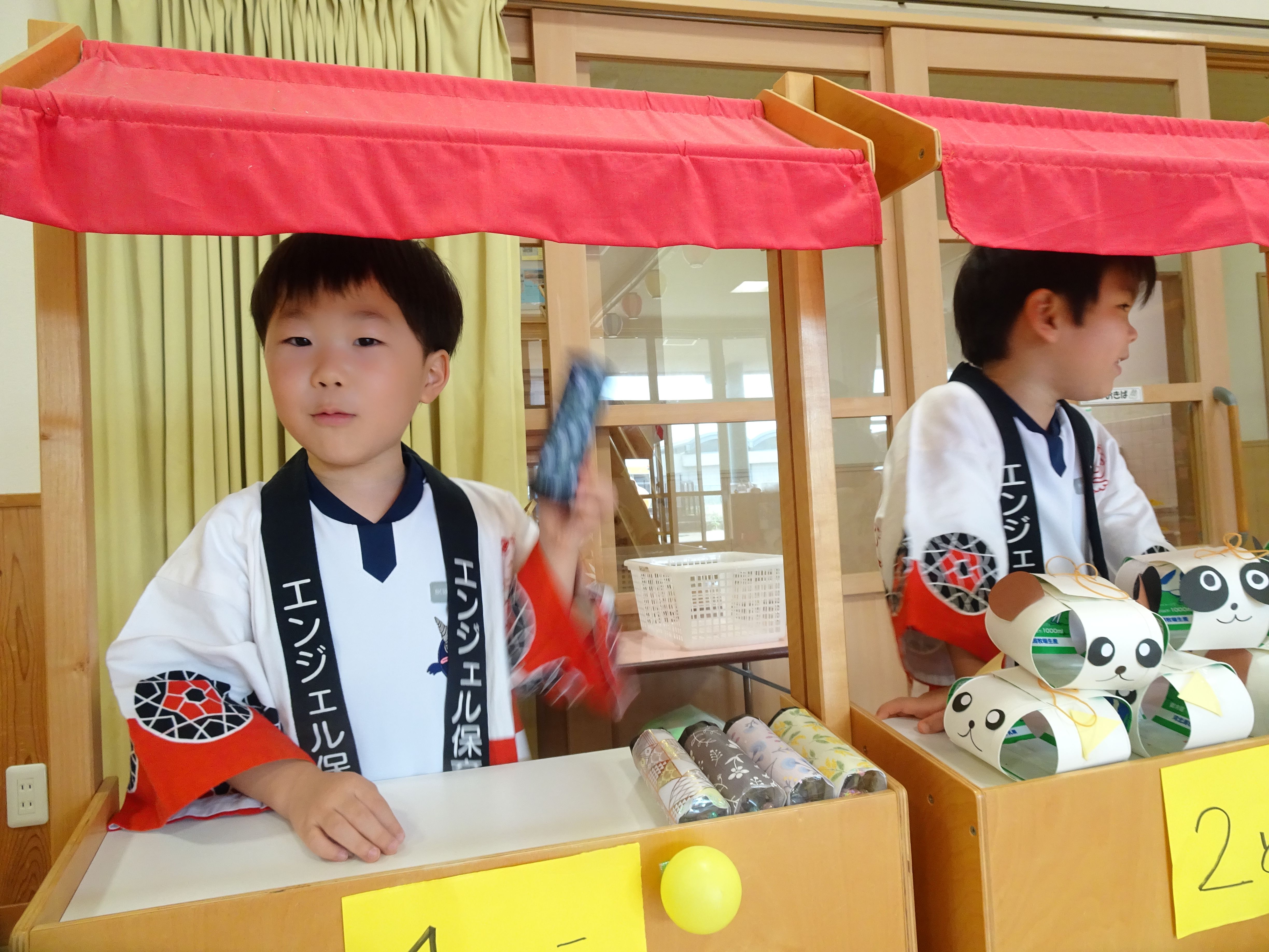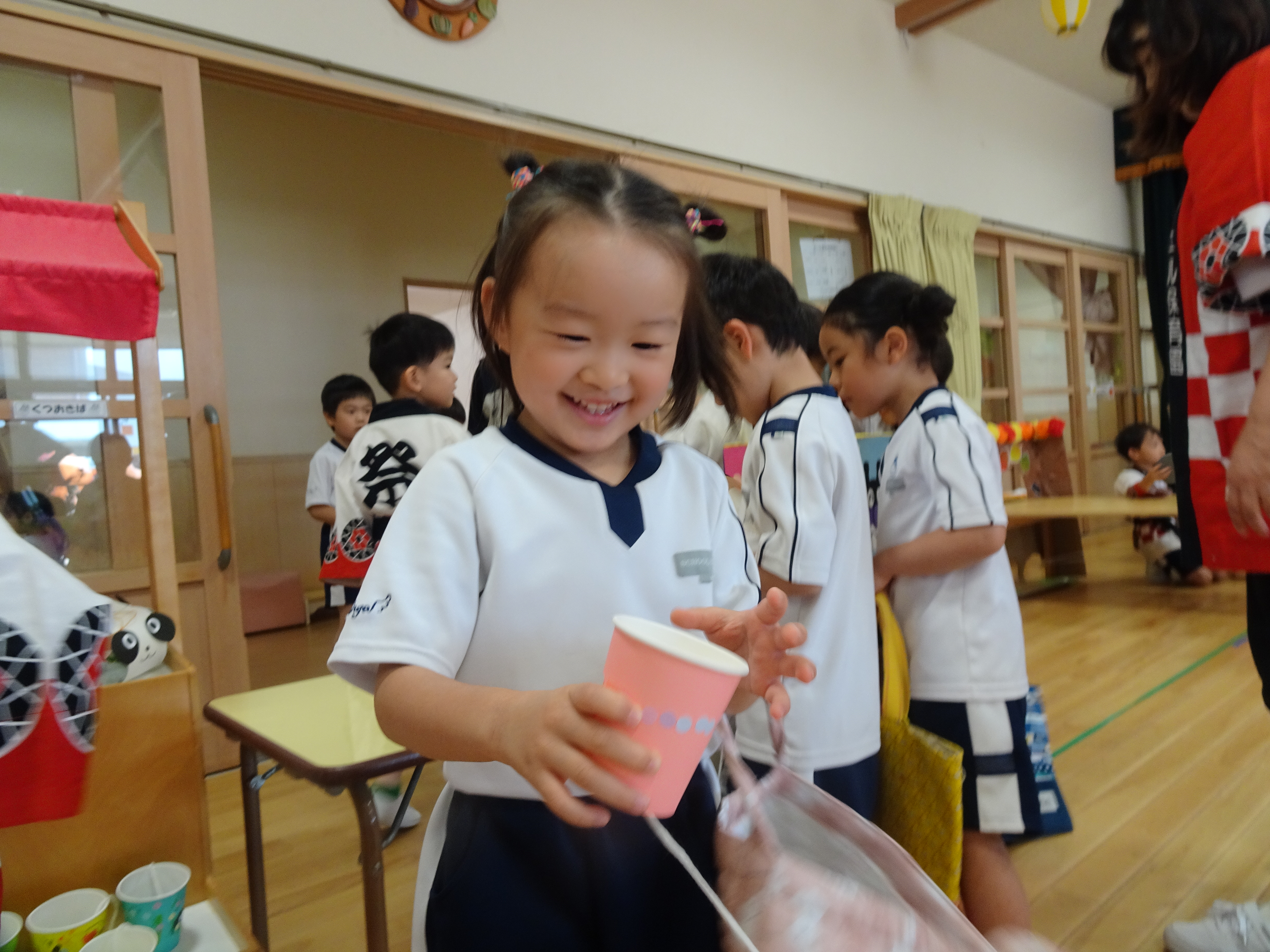夏祭り2日目は縁日ごっこでした! 前日からホールに見に行ったり楽しい雰囲気を知っていたのでとってもわ...