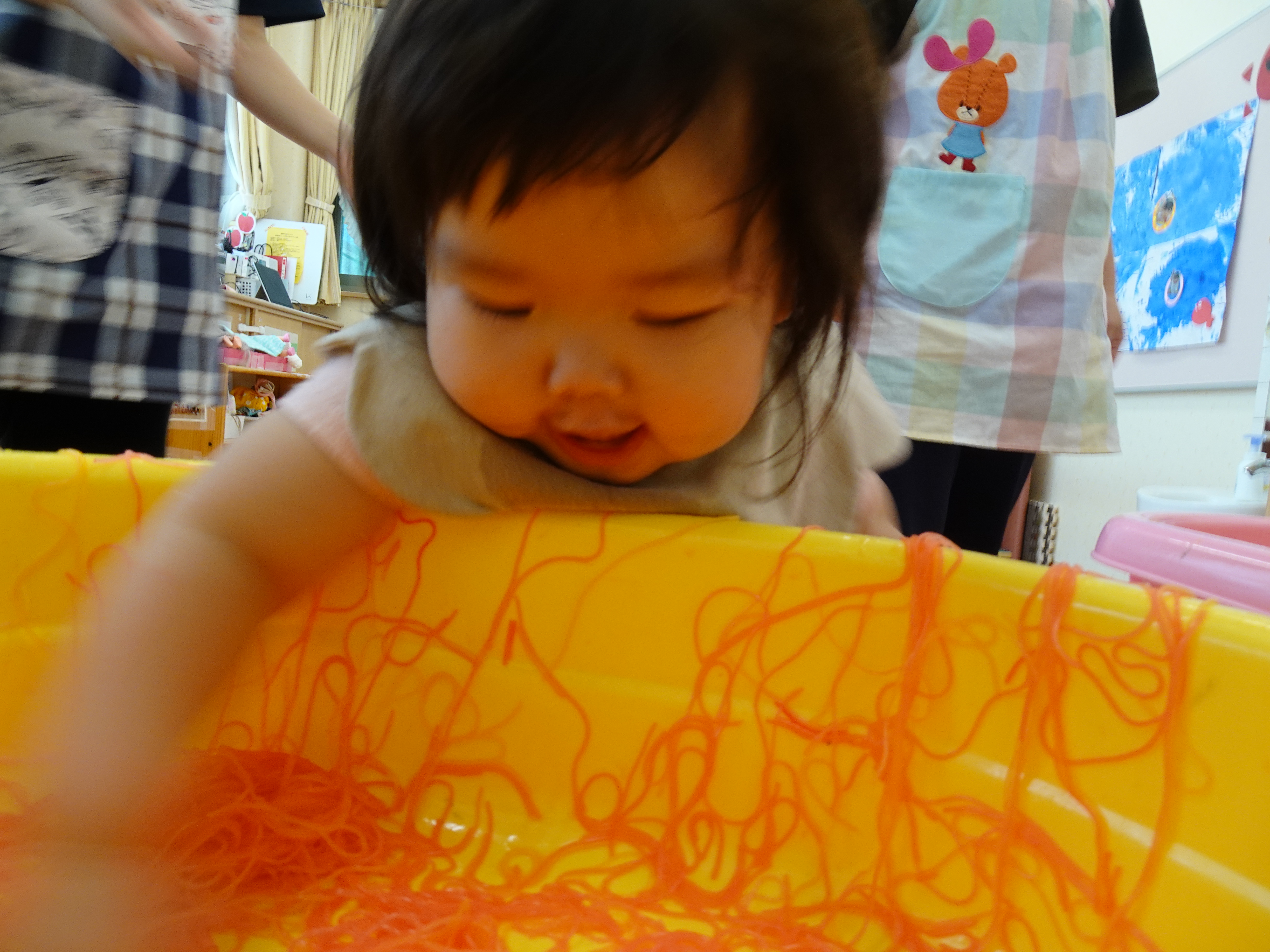 久しぶりに大人気!春雨さんの登場です👏 保育者が「これなーんだ?」と子どもたちに春雨を見せると 「ち...