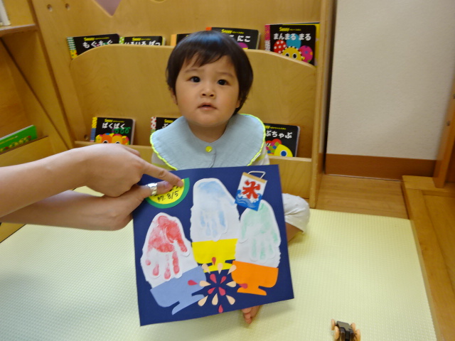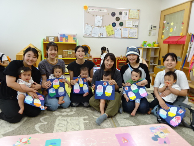今日は手形アートの日ということで手形でシロップを表現して、かき氷を作りました。 好きな色のスタンプを...