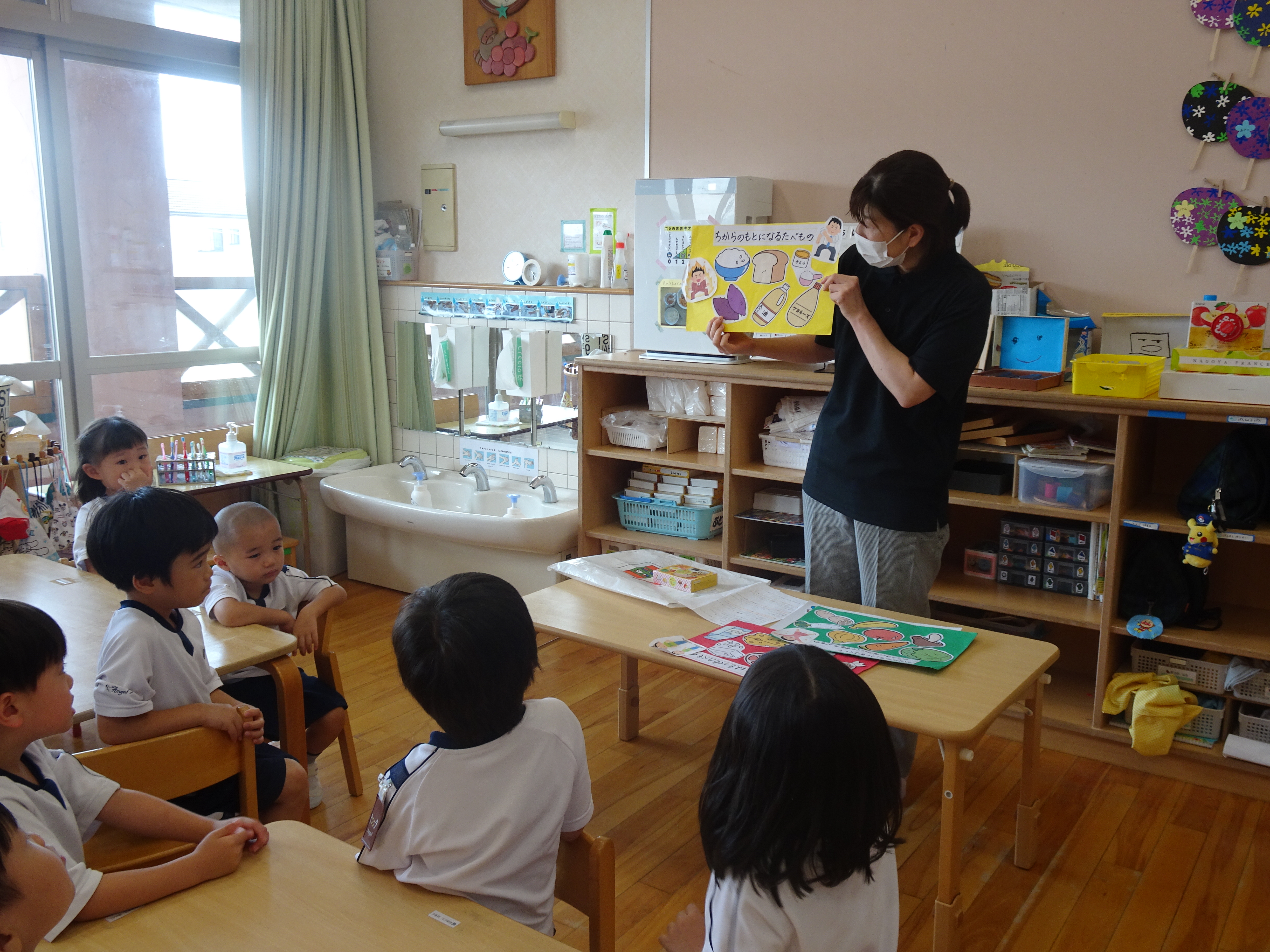 給食先生による食育講和がありました。 今回は三食栄養のお話を聞きましたよ! 赤は体を作る食べ物、黄色...