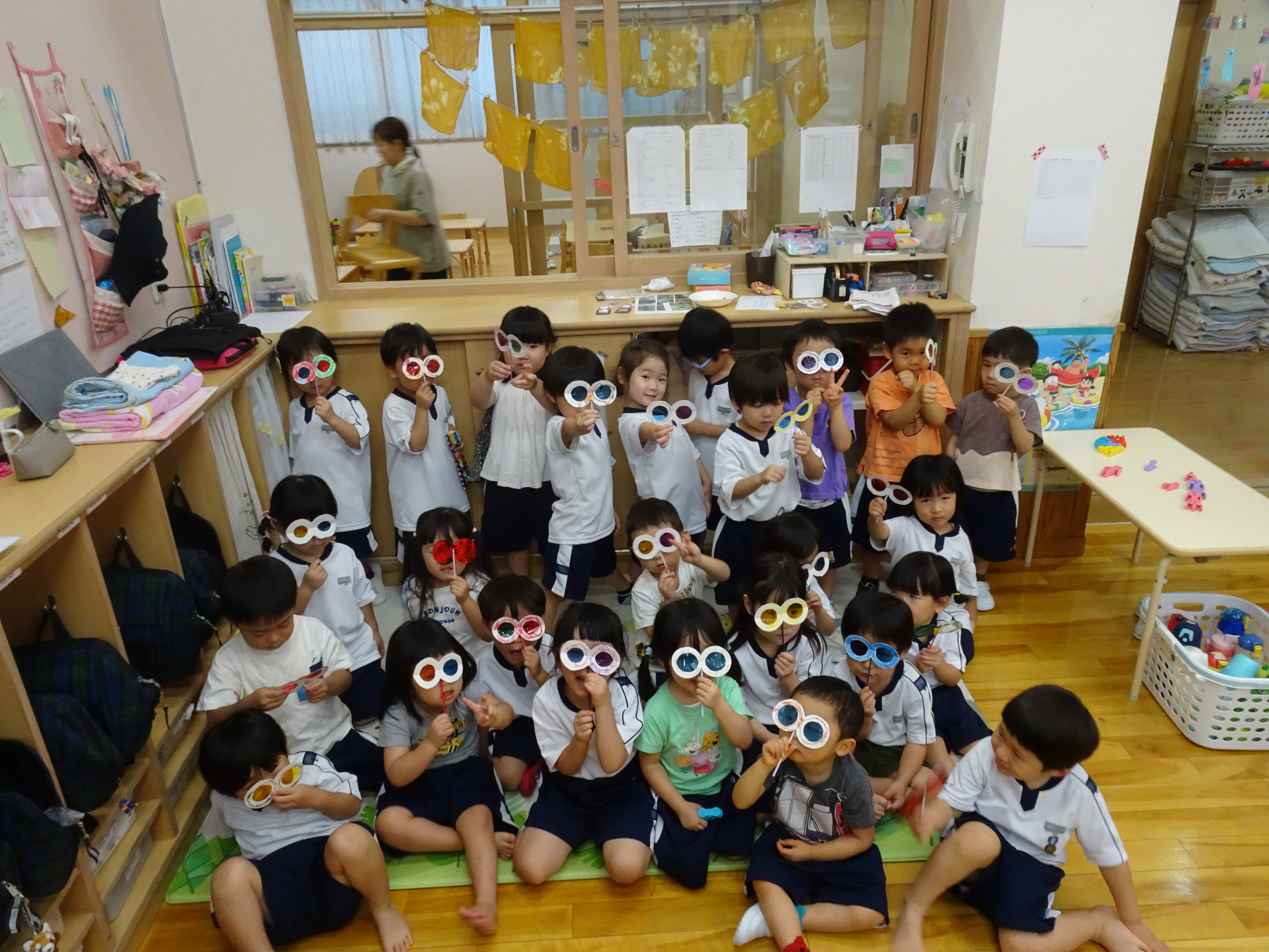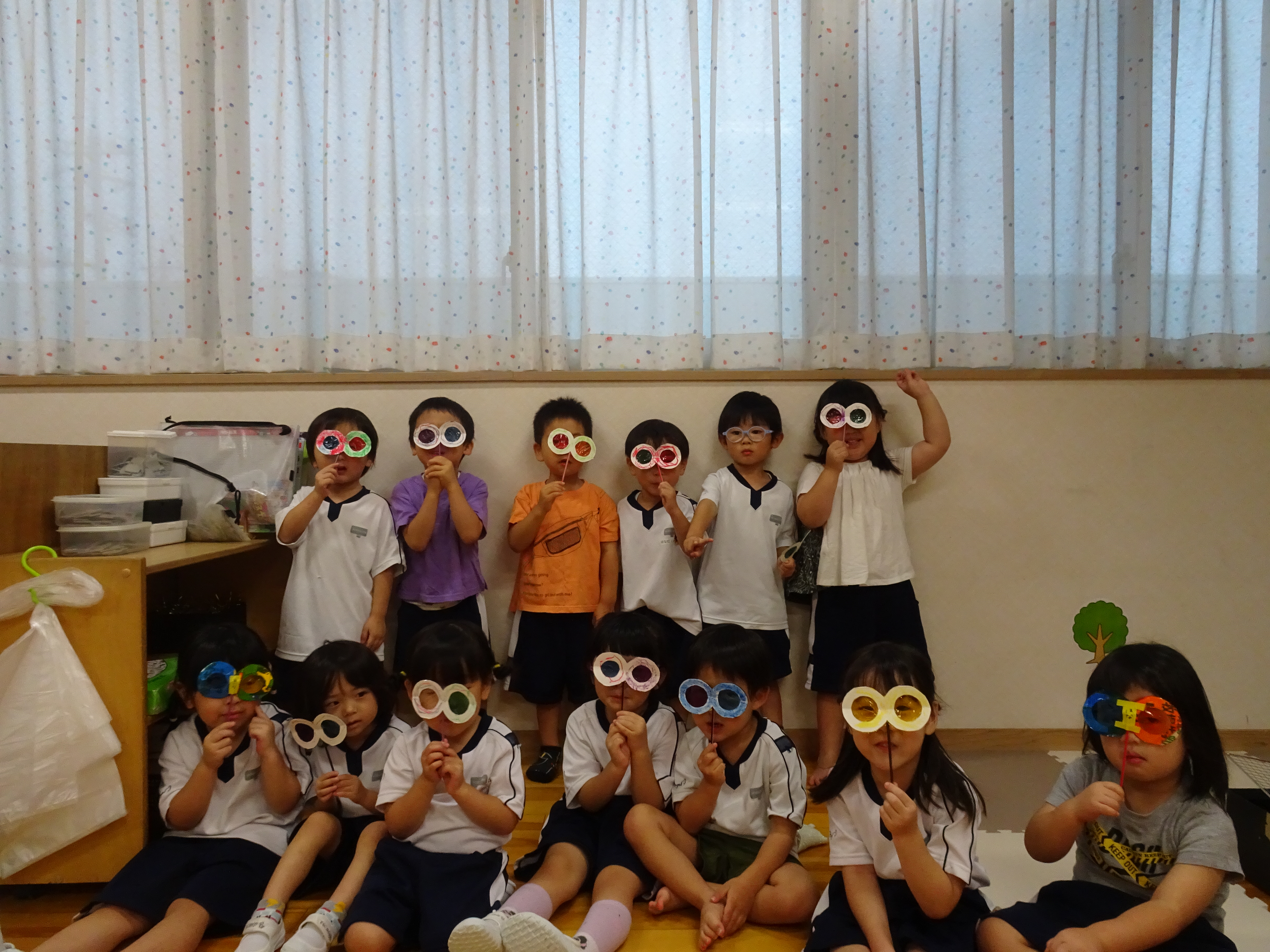 今日はみんなでとんぼの眼鏡を作りました! カラーセロファンでめがねにしたい色を選び、のりで貼りつけま...