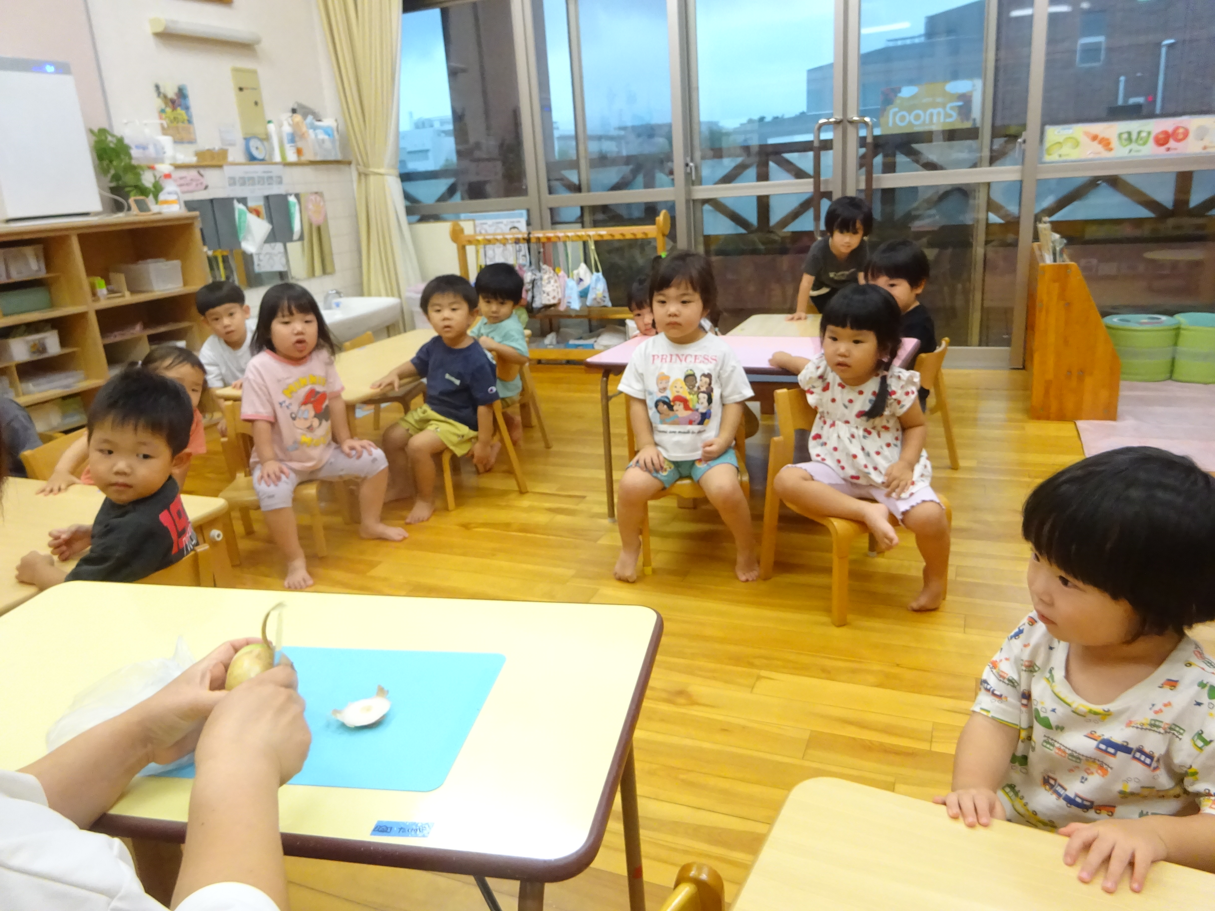 今日はもも組さんになって初めてのクッキングをしました! ももさんの育てていたピーマンが大きくなって収...