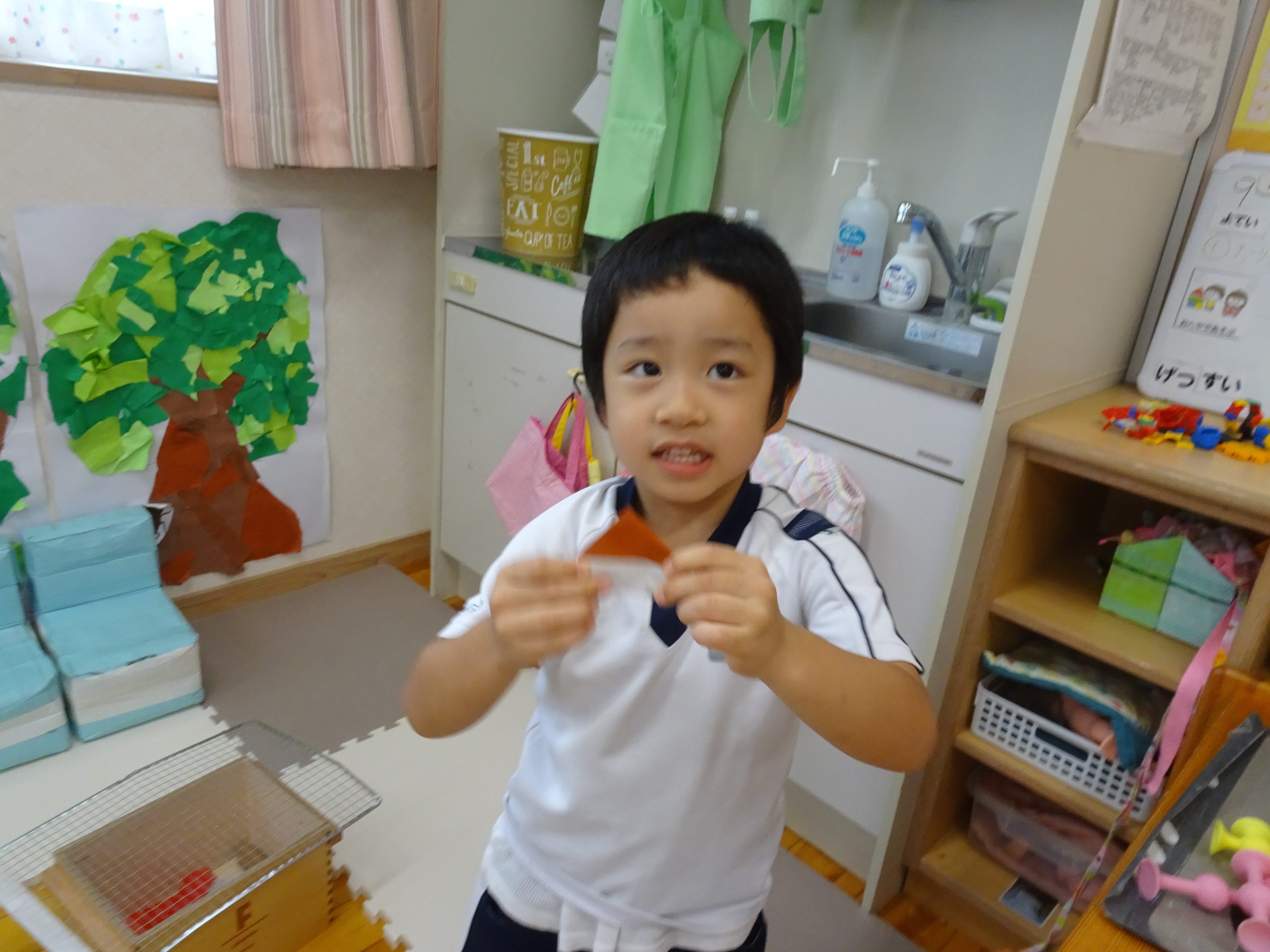 今日はみんなで栗拾い!をお部屋でしようと思ったのですが… 折り紙で作った栗を子ども達に見せると「どん...