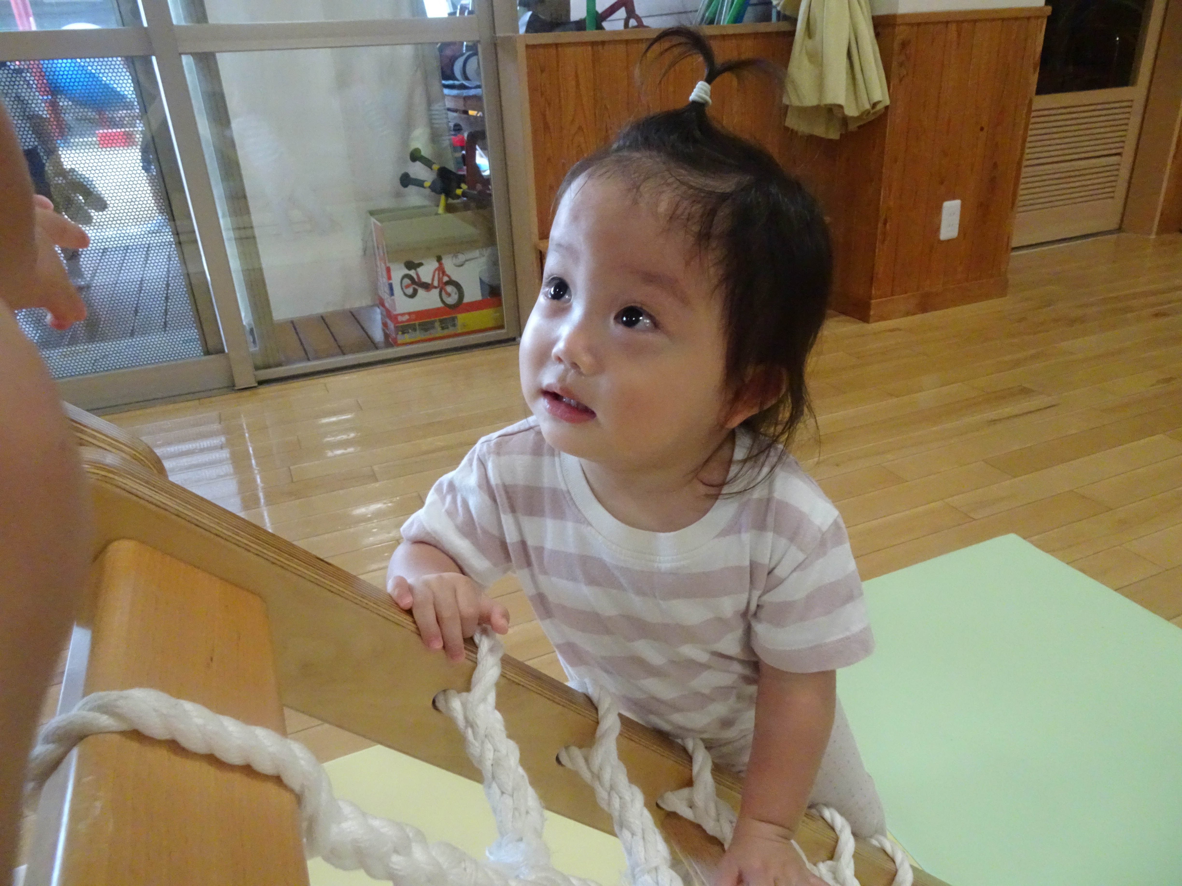 今日はホールで遊びました。ホールでは巧技台やトランポリン、コンビカーなどいろいろな遊具があり自由に遊...