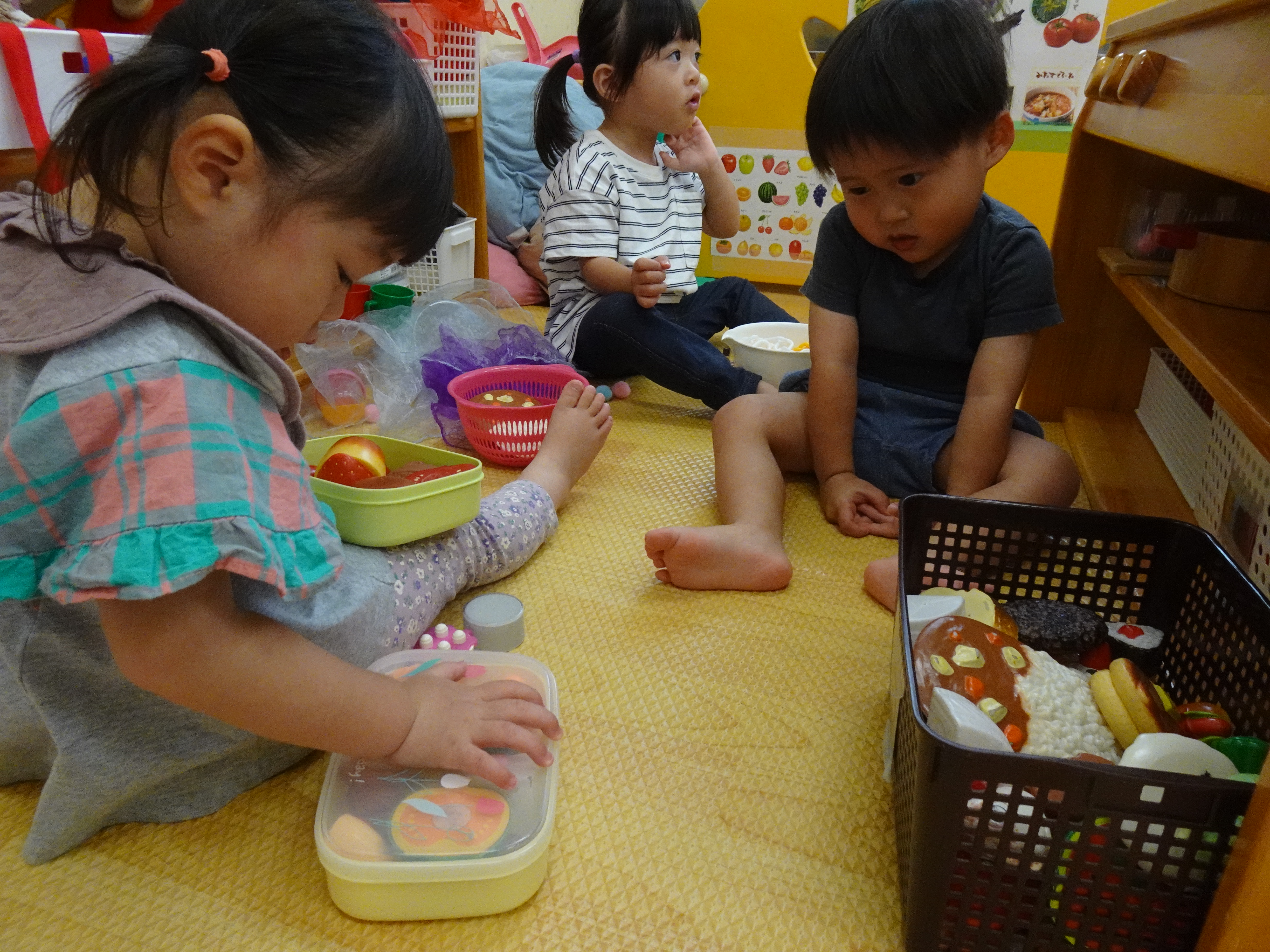 おままごとでお弁当を作っていたIくん。 たくさん食べたいものがあり、お弁当箱に入れ込むも蓋が閉まらず...
