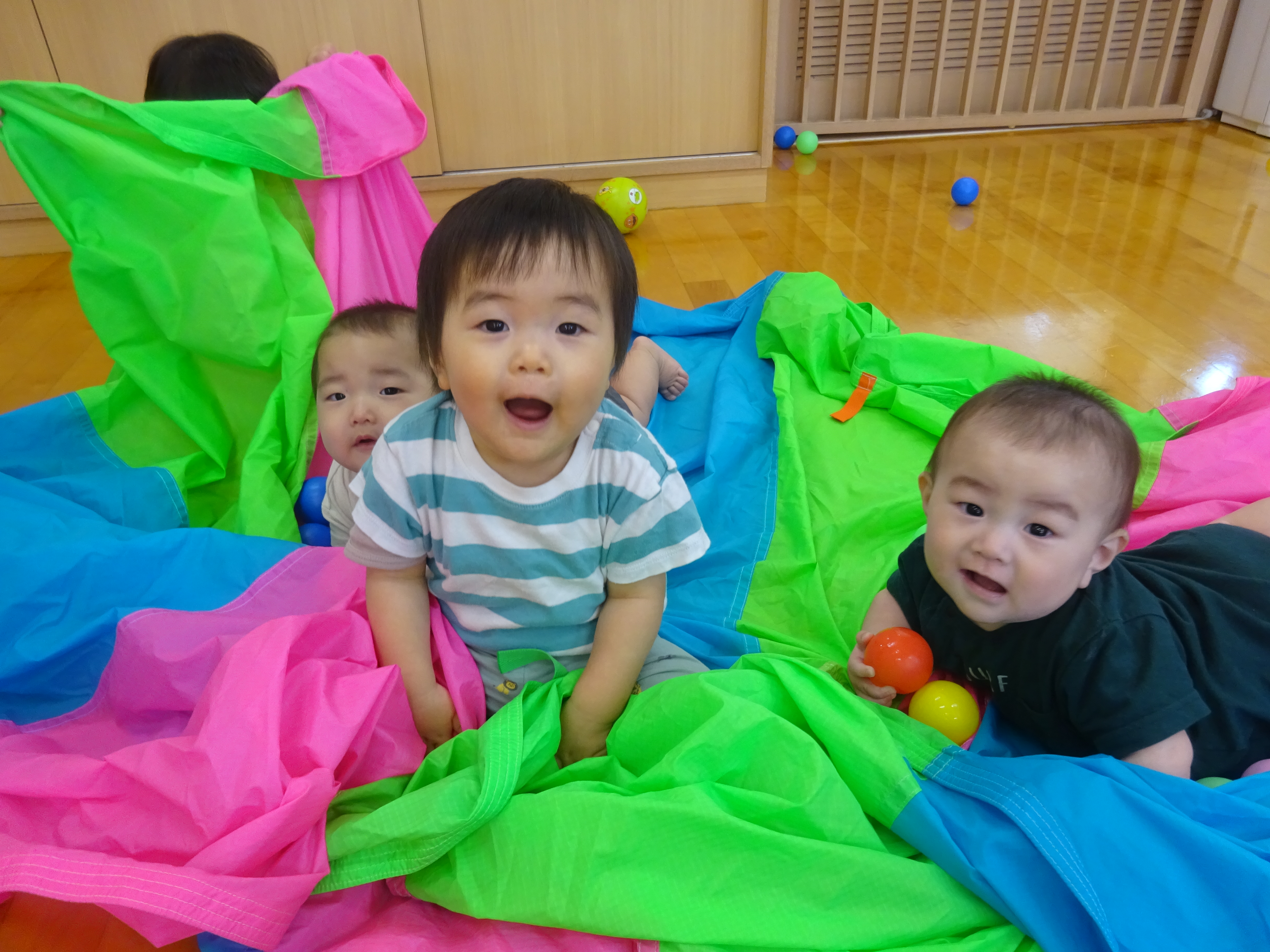 今日はパラバルーンで楽しんでみました☆ 準備している段階からやる気満々のいちごちゃんたち!! 保育士...
