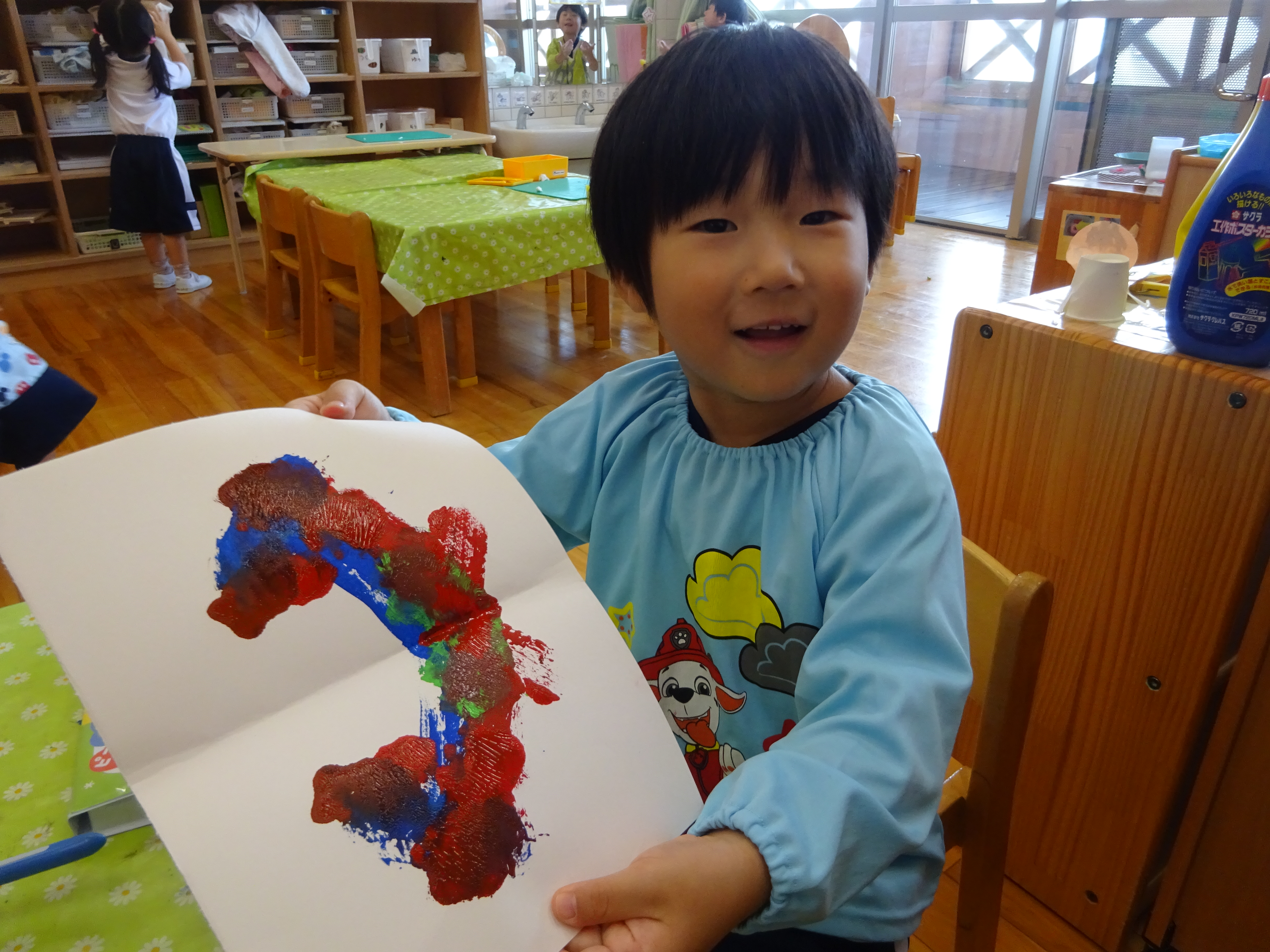 かかしをつくりました! 絵の具を多めに画用紙につけていって折ってひらくと・・・ わぁ!模様がかわった...