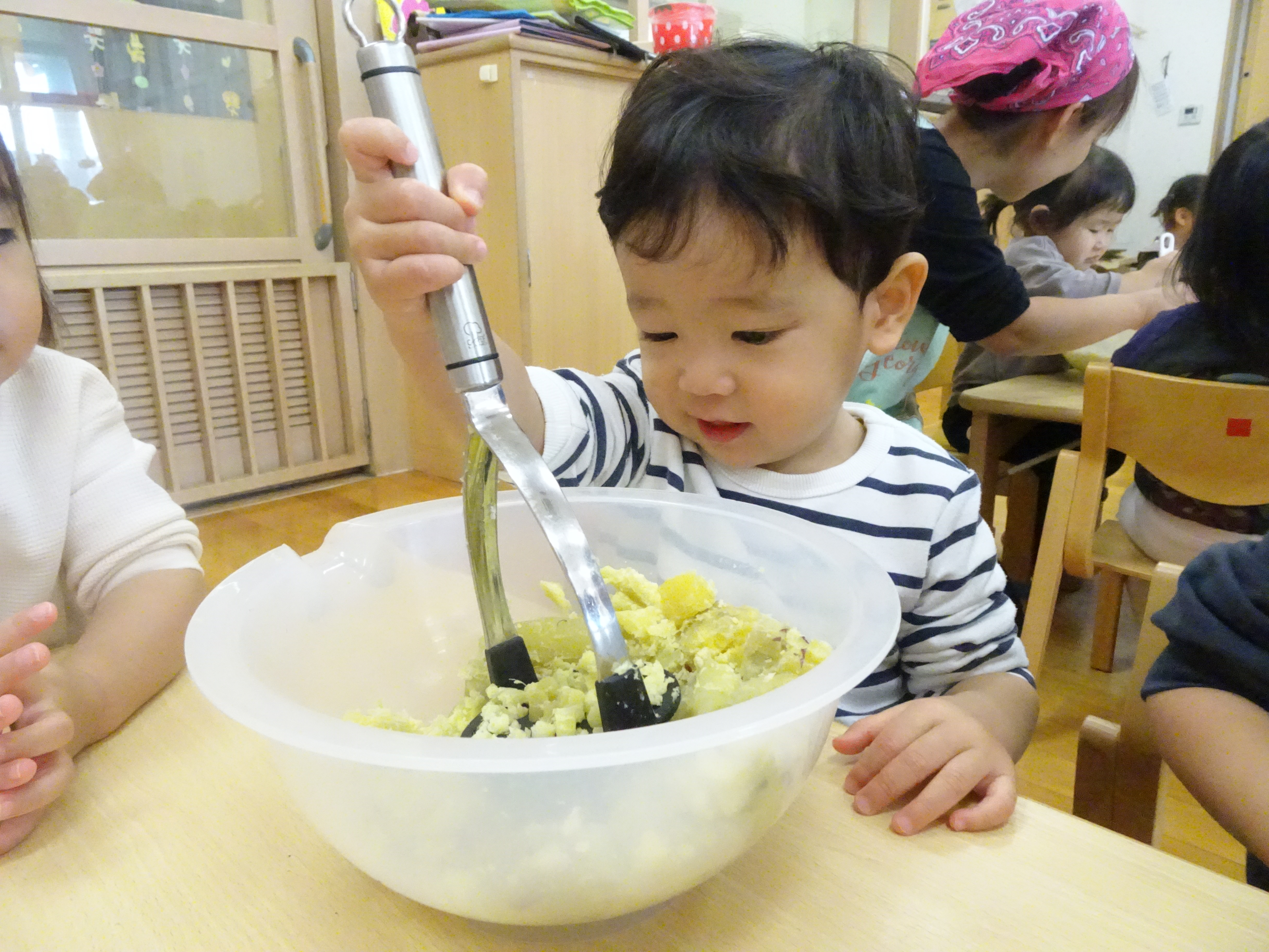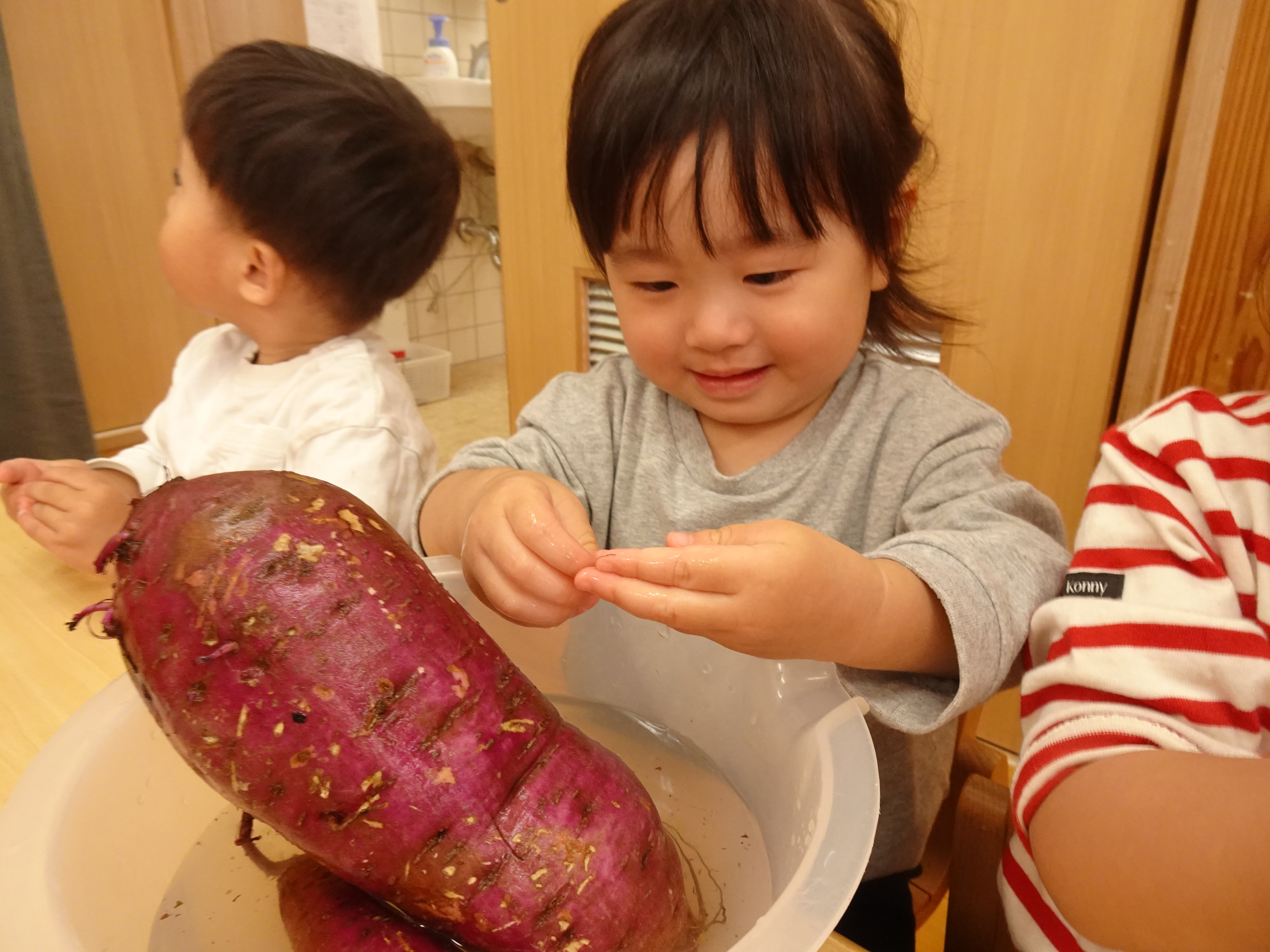 さつまいもをお風呂で洗ったあとは・・・ マッシャーを使ってみんなの腕力をお借りして♡「ぎゅっぎゅっ!...