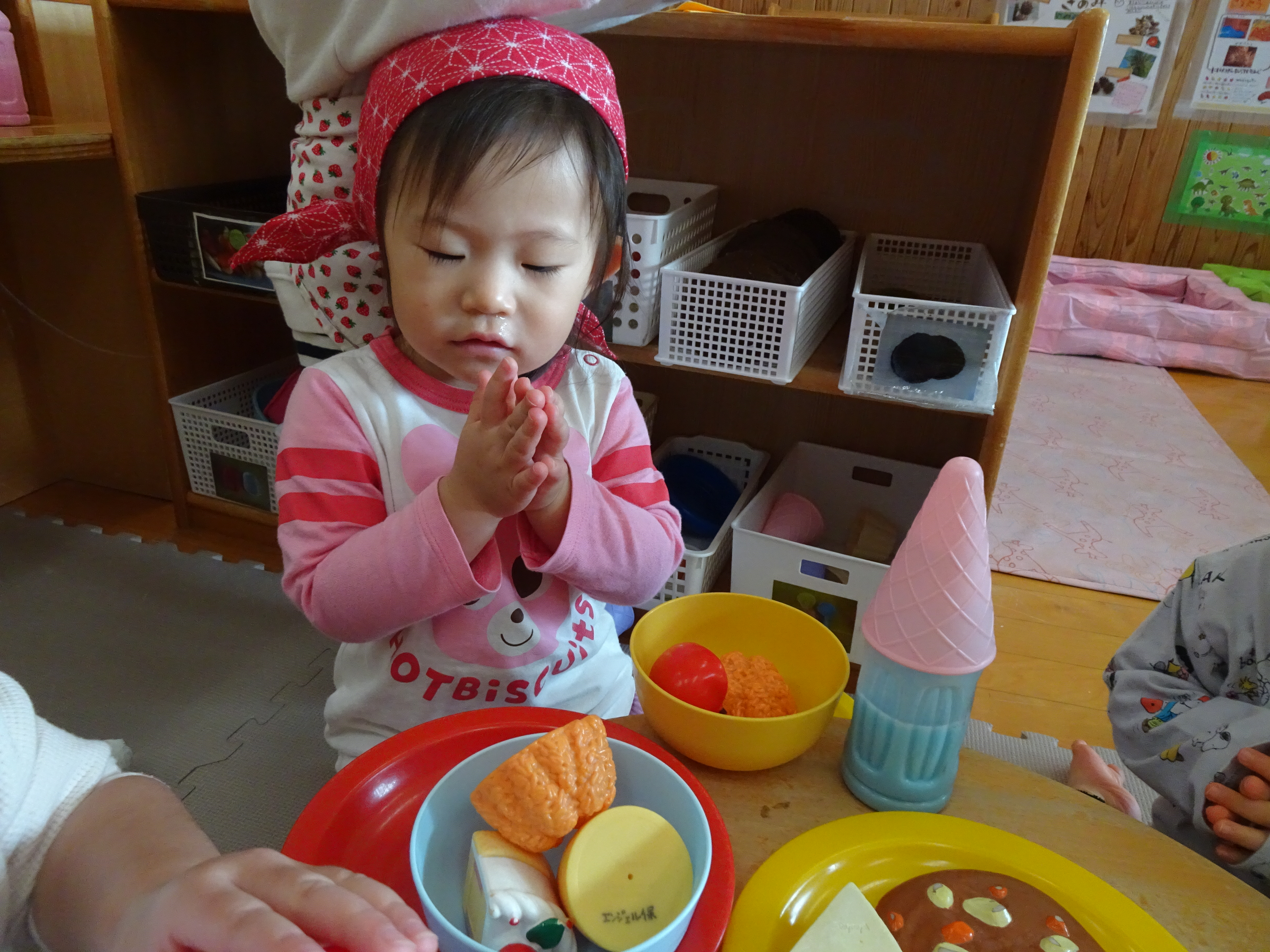 今日はおままごとのテーブルをみんなで囲んでお料理を作って楽しんでいました🍳 Yちゃんはバンダナを頭に...
