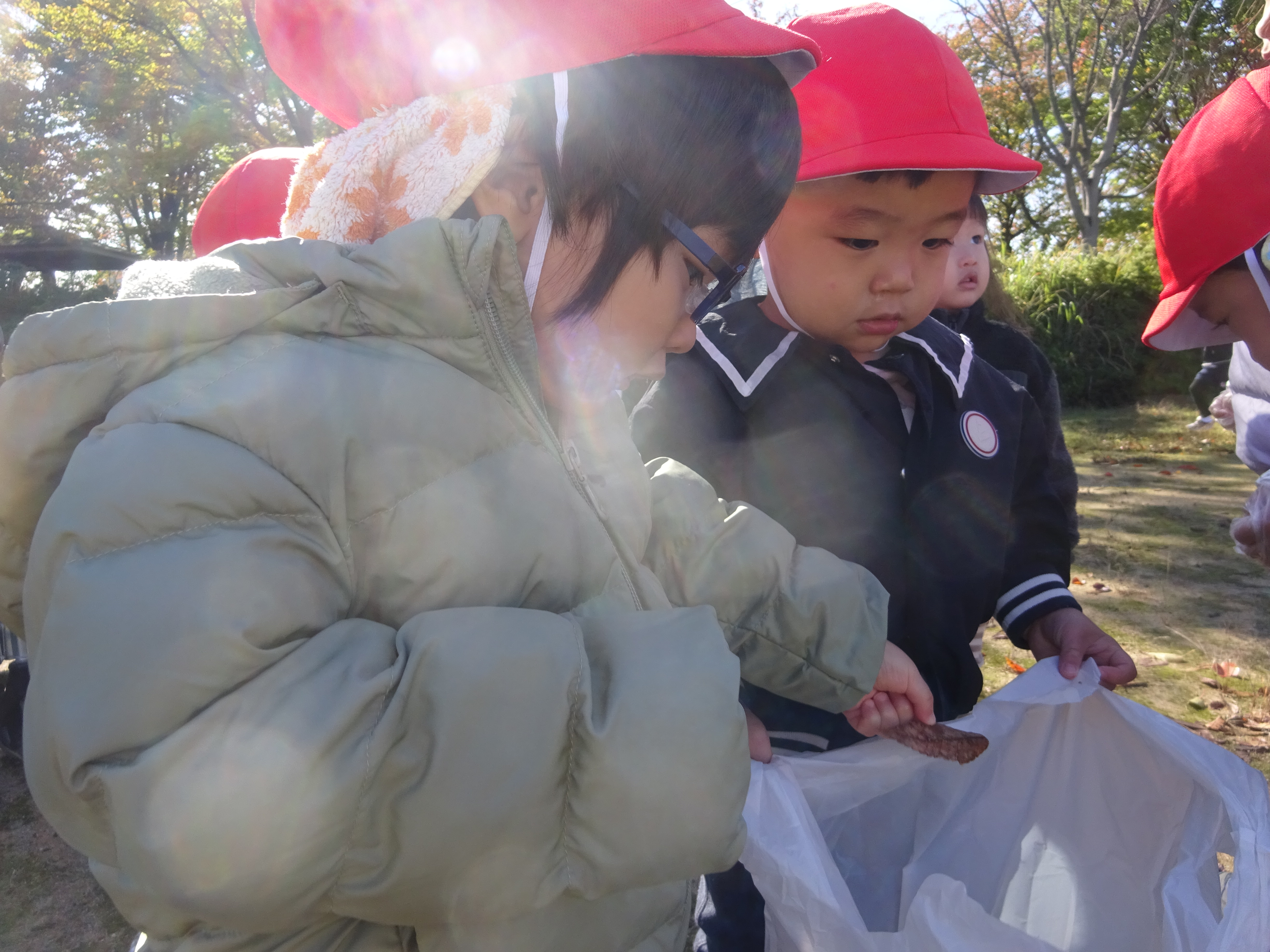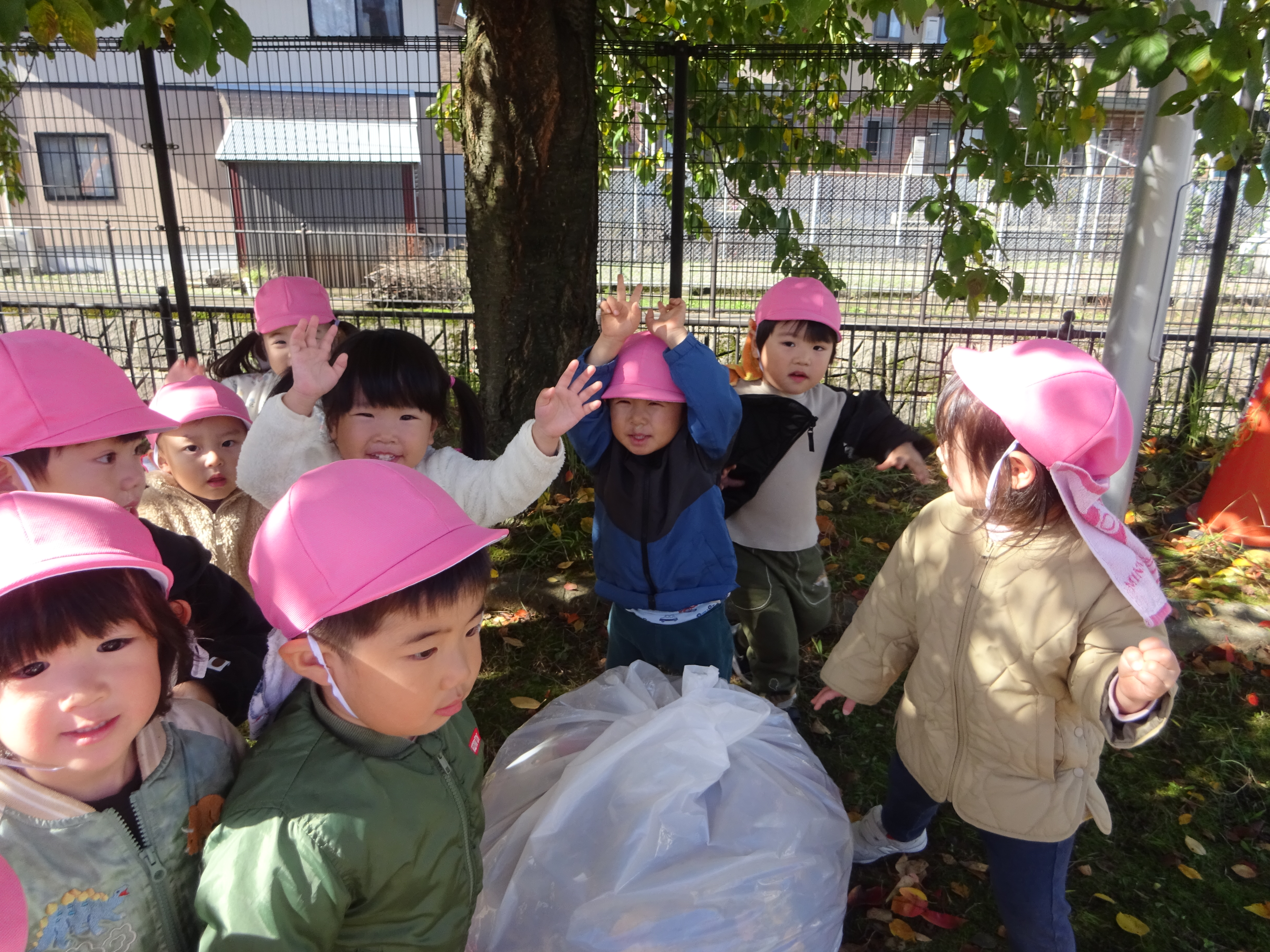 今日はやまいろ公園で落ち葉拾いをしました。 葉っぱ拾ってね~と声をかけると落ち葉を拾い袋の中に「ぽー...