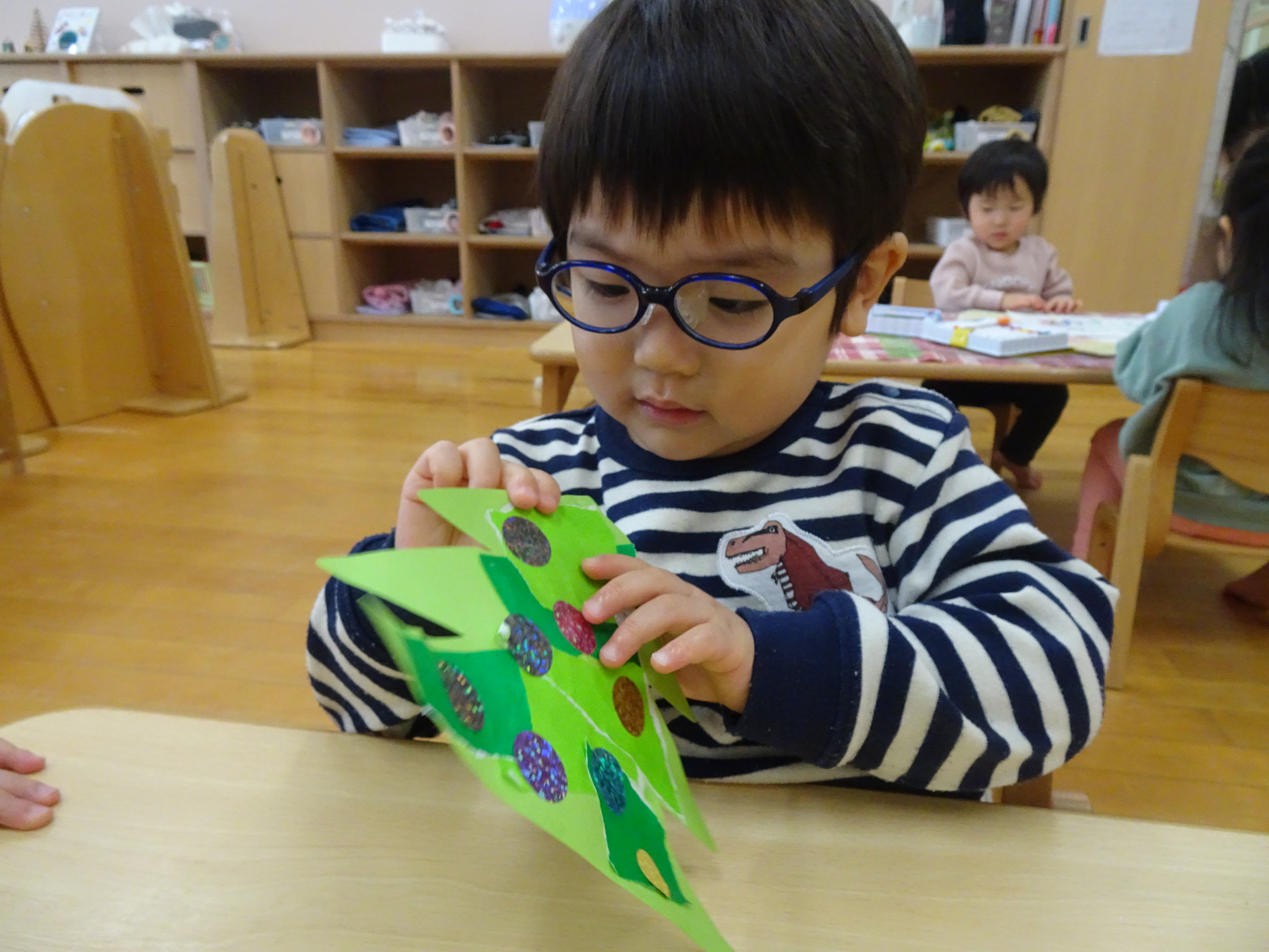 12月といえば「クリスマス」 お部屋では、クリスマス制作をしています☆今日は可愛いツリーにシールを貼...