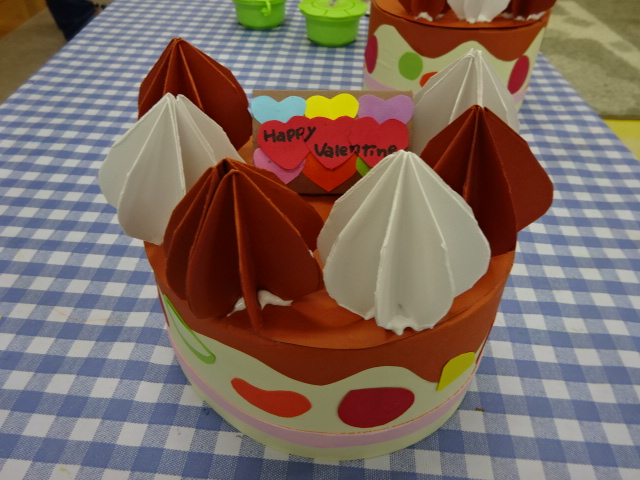 今日はバレンタインに向けた工作の2日目でした。 ケーキの側面に果物を貼ったり、上のプレートにハートを...