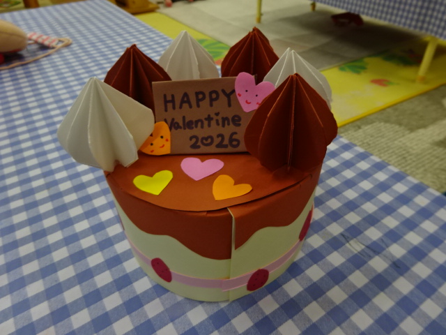 今日はバレンタインに向けた工作でケーキを作りました。 親子でのり付けやペンで果物の種をちょんちょんと...