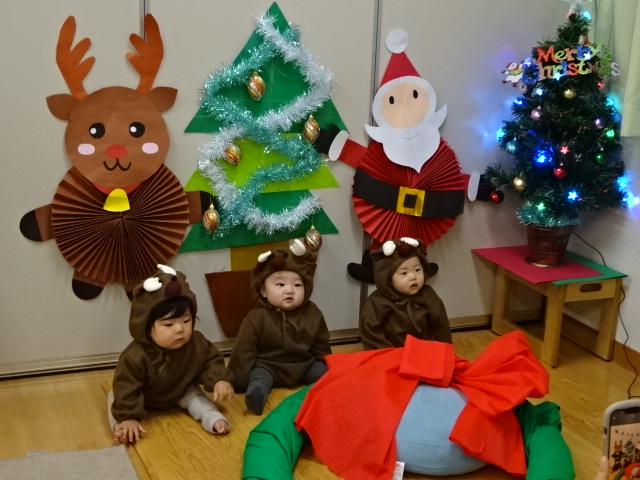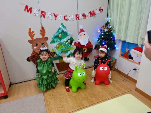 クリスマスフォトコーナーに午後から遊びに来てくれました。 3人おそろいのトナカイさんです! 「こっち...
