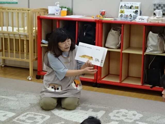 次に「にゃんころたいそう」という絵本を見ました。ねこの動きに合わせて伸びたり丸まったりしました。