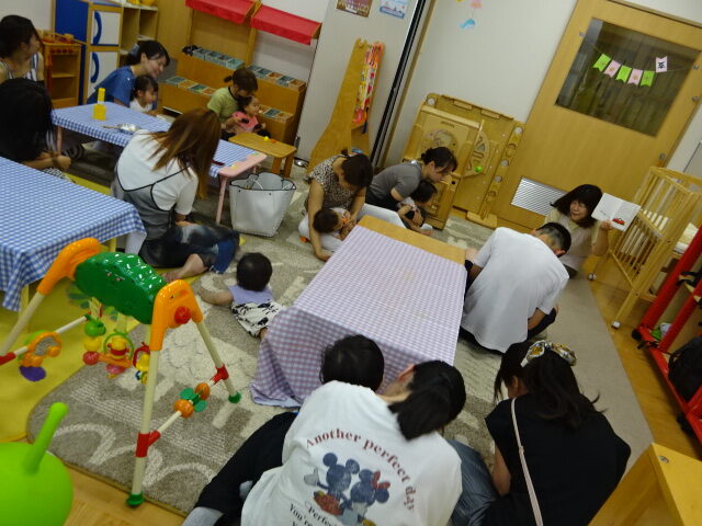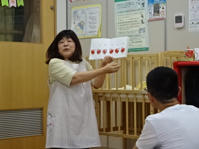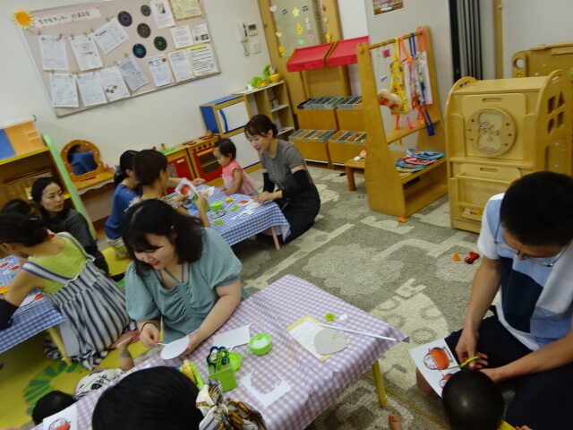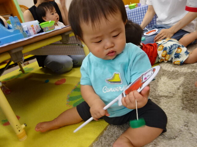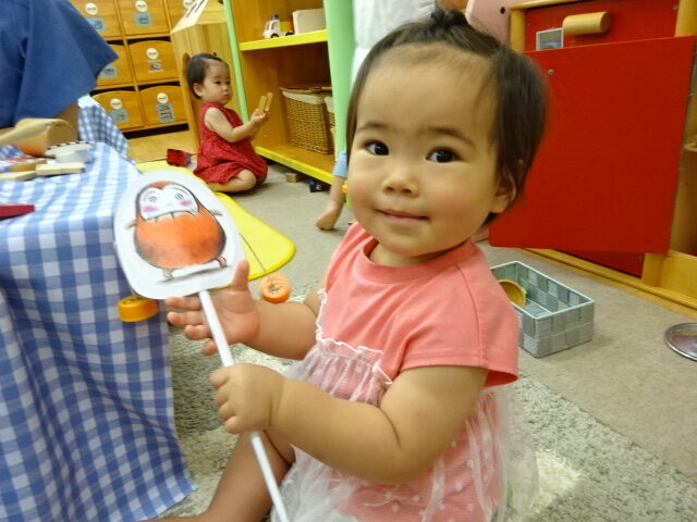 7月23日が「ののいち子ども読書の日」ということで、絵本に親しみを持ってもらうためにみんなが大好きなだるまさんシリーズから「だるまさんが」を見て、でんでん太鼓作りをしました。