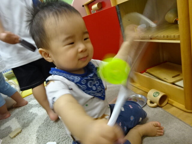 絵本はセリフに合わせて、「どてっ」と転ぶ真似をしたり「びろーん」のページでたかいたかいをしてもらったりして楽しみました。