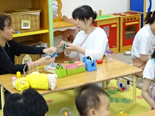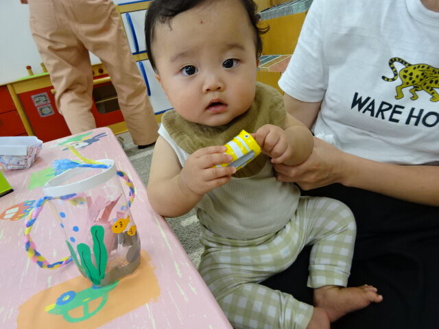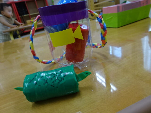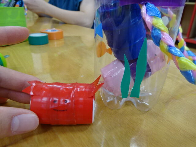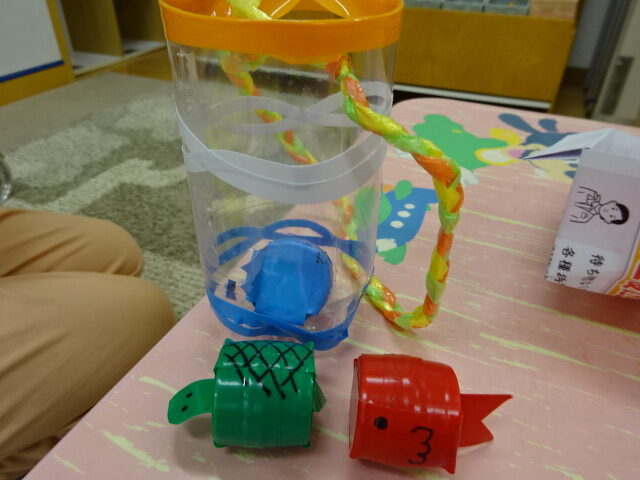 今日は作ってHappy!の日ということで、ペットボトルに紐を通したものにビニールテープで装飾をして、入れ物を作り、ペットボトルキャップ3~4個を繋ぎ合わせてカメやカニなどの海の生き物を作りました。