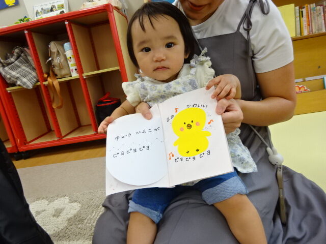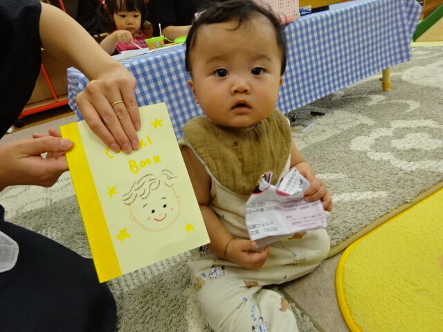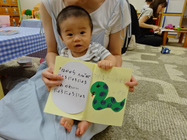 今回もペンやクレヨンで顔を描いたり画用紙で好きな形に切り貼りしたりしてオリジナル絵本を作っていました。完成した作品を親子でにこにこと読んでいましたよ♪