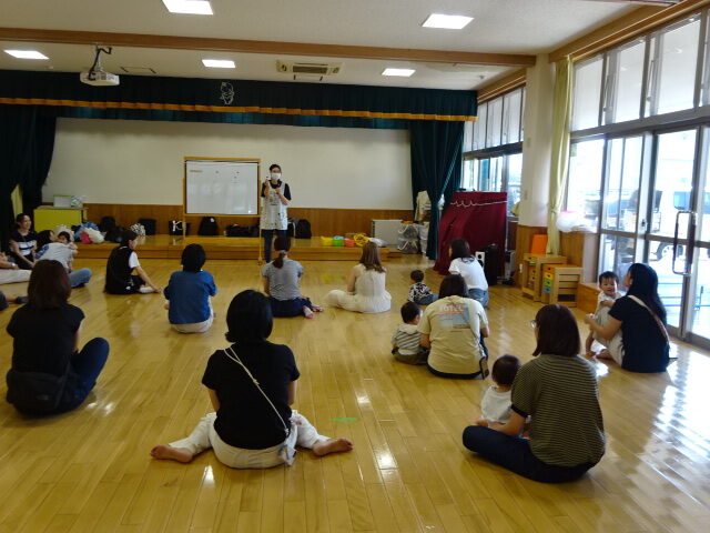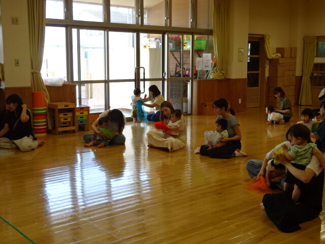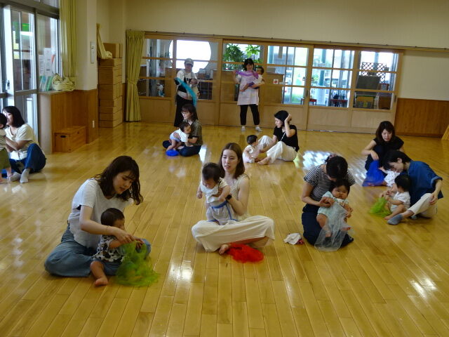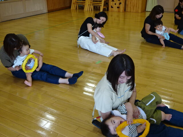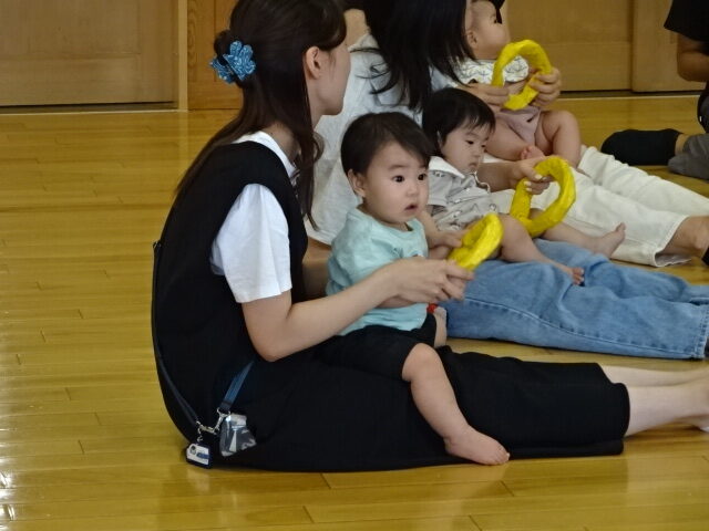 0歳児対象でしたが、首の座っていない子からハイハイ、つかまり立ちができる子までいろんなお友だちが参加してくれました。お子さんの好きな体勢で楽しみました。