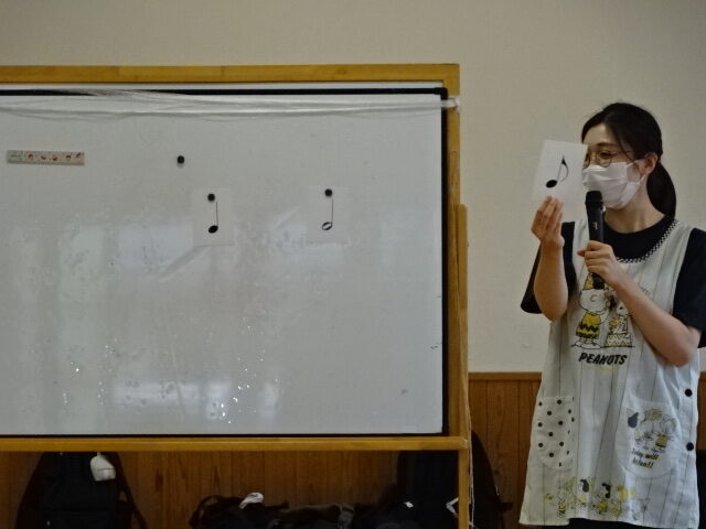 まずは八分音符、四分音符、二分音符の音に合わせてほっぺやおなかなどやさしくさわっていきました。