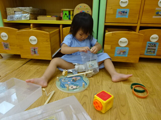 魚釣りや滑り台、絵本など、好きなおもちゃを自分で選んで遊んでいました。