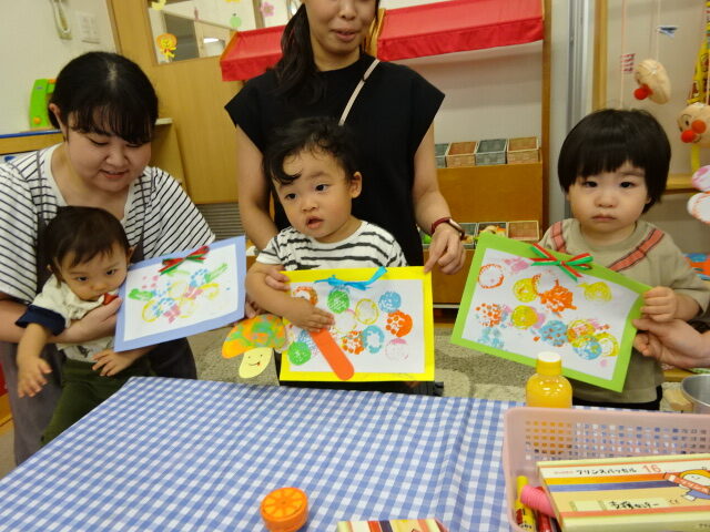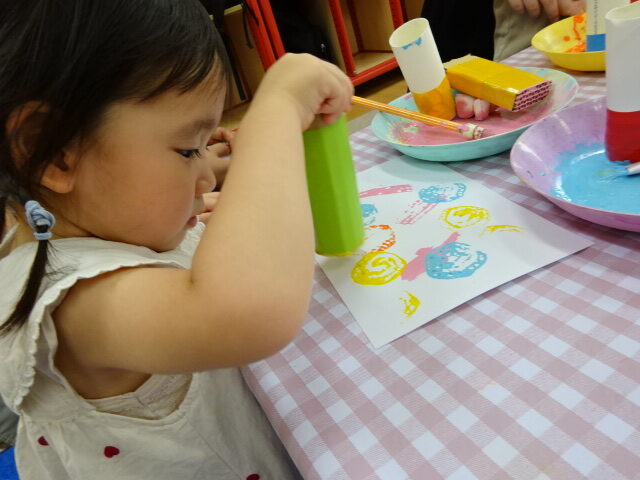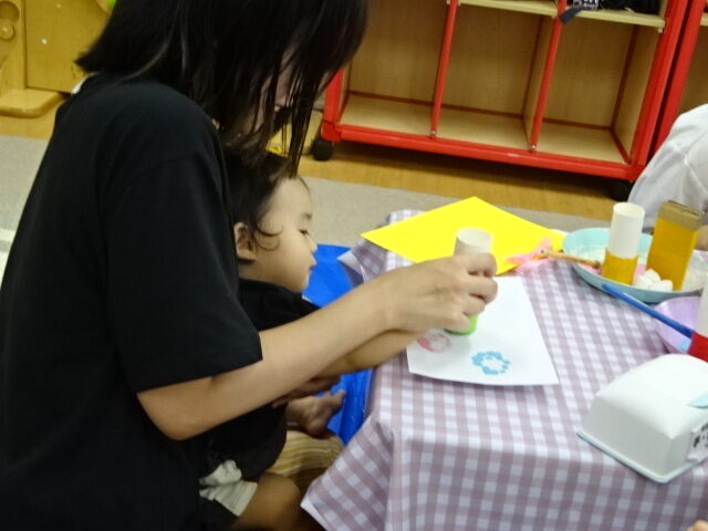 ダンボール、緩衝材、滑り止め・・などいろいろな素材でできたスタンプを画用紙にスタンピングしました。自分で上手に好きな色を選んでスタンプしたり、おうちの人と一緒に持って色が付く様子を楽しんだりしていました。
