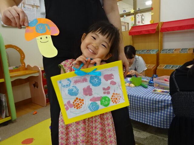 もうすぐ9月ということで、スタンプした画用紙を使ってトンボやきのこの秋の製作も楽しみました。