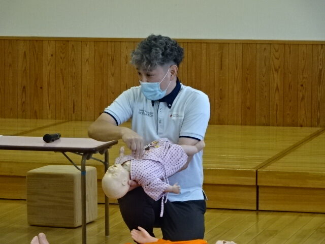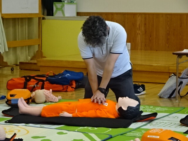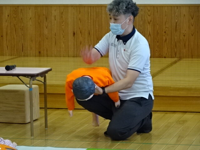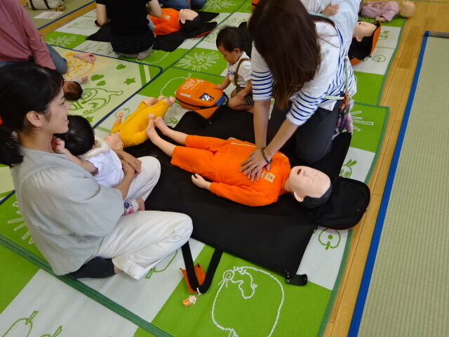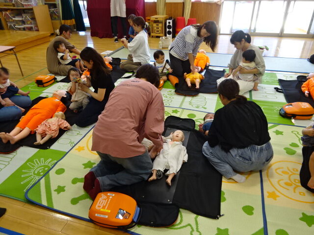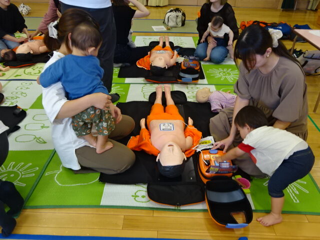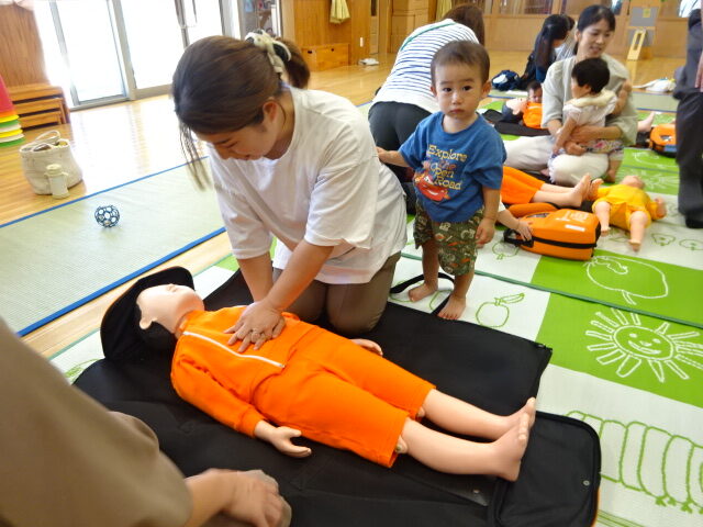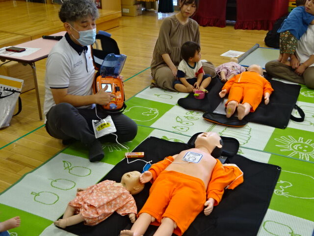 心臓マッサージの仕方、AEDの扱い方、誤飲誤嚥をした時の対応などを教えていただきました。