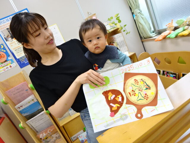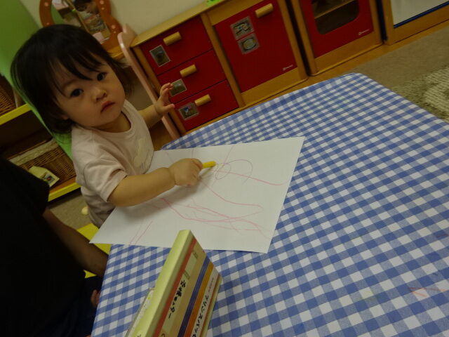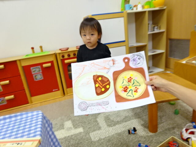 クレヨンでのお絵描きも楽しんでいました。かわいいピザとカレーの作品が出来上がりました♡