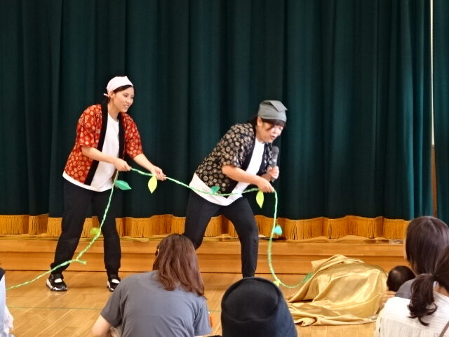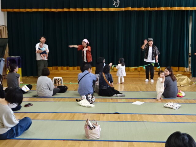最後は「おおきなおいも」の劇をしました。最後はみんなでおいものつるを引っ張って「うんとこしょ どっこいしょ」をかけ声を言いました。おおきなおいもの収穫をみんなで喜びましたよ♪