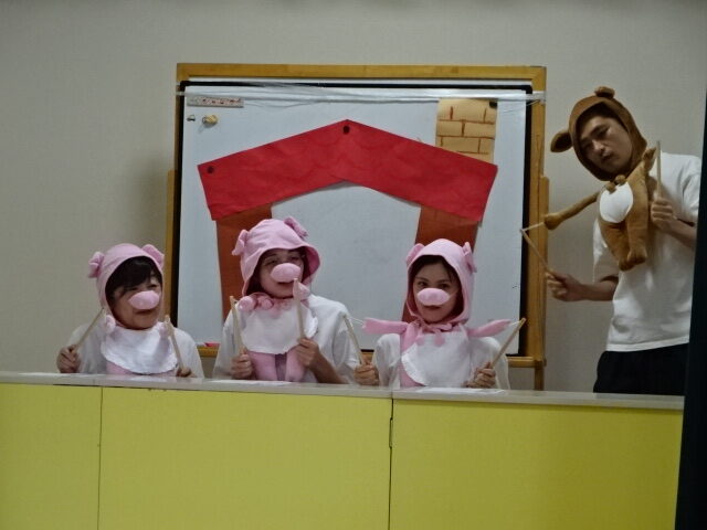 次は、保育教諭による「三匹のこぶた」のフェイスパペットを見ました。
