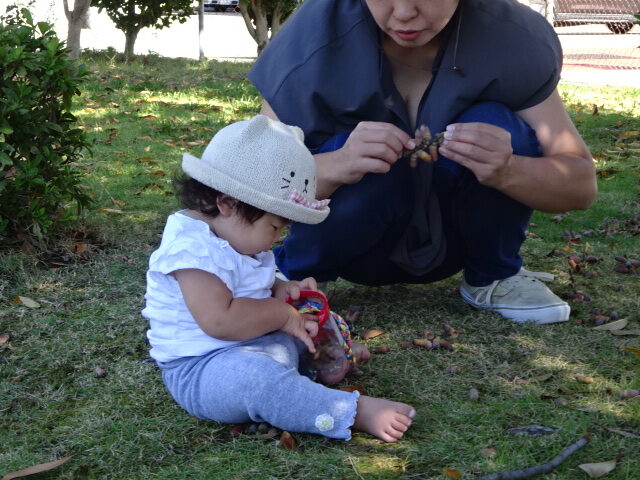 「お弁当をここで食べたいね」なんて言いながら、公園に落ちているドングリを拾ったり、きれいな落ち葉を拾ったりしましたよ。