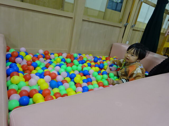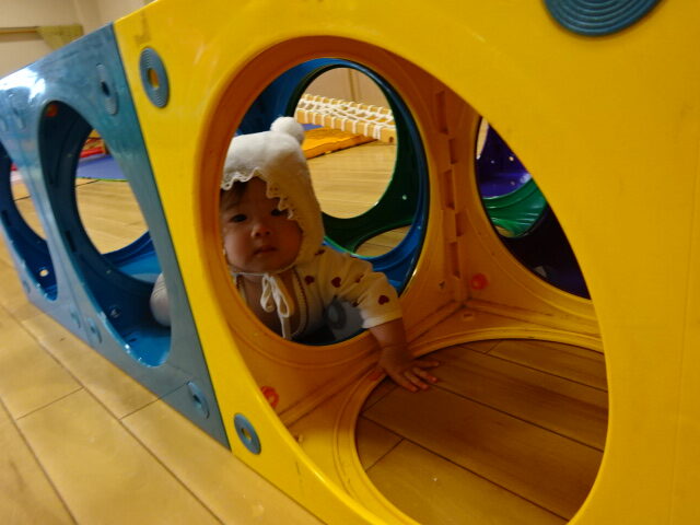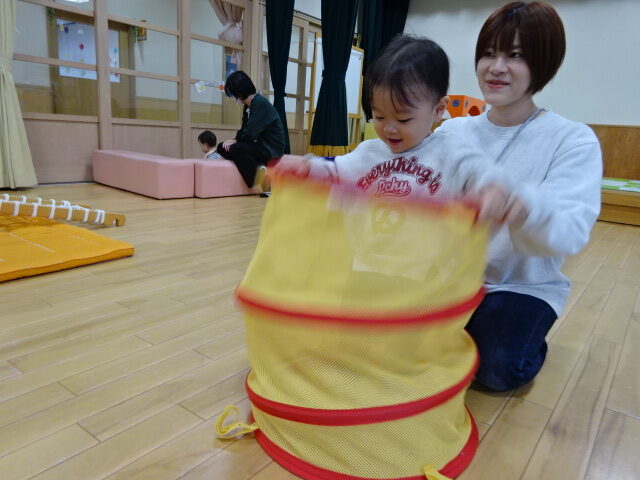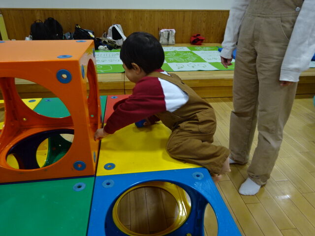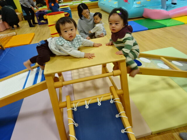 似た月齢のお友だちと一緒に笑顔でジャンプをしたり、おうちの人に遊びたい遊具を指さしたりする姿も見られましたよ。