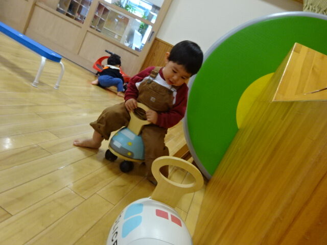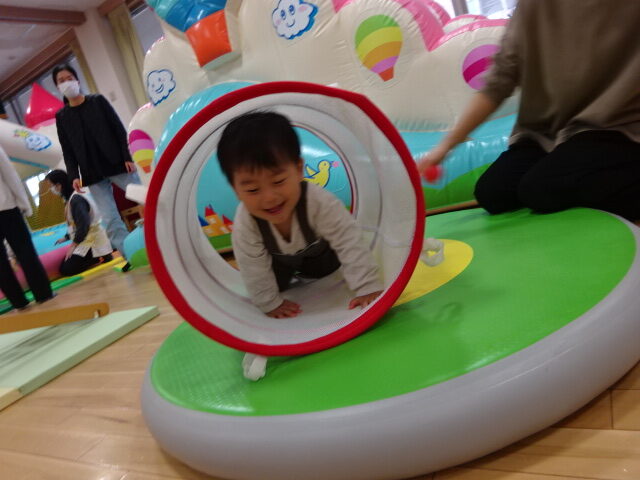 巧技台に登ったり降りたりしたり、トランポリンでジャンプをしたり、おうちの人と一緒に滑り台を滑ったり、乗り物に乗って遊んだりと、それぞれ楽しんでいました。