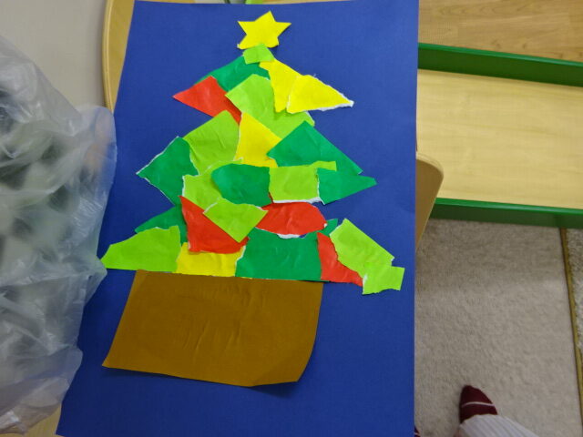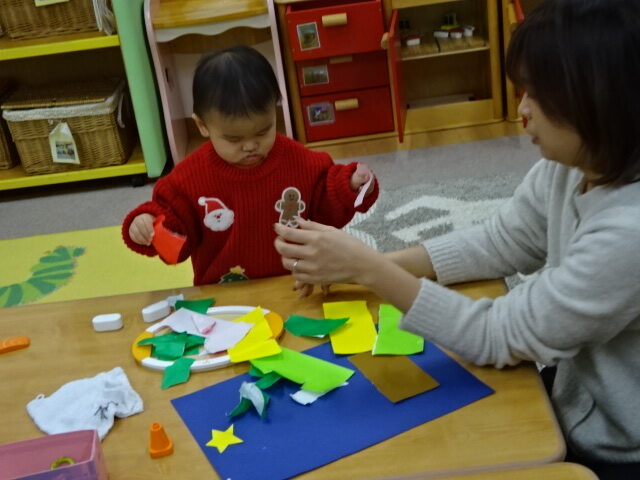 まずは製作から。親子で折り紙をちぎってかわいいツリーをつくっていましたよ!