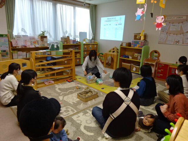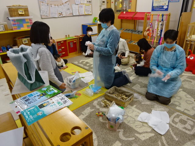 支援センターに遊びに来られる方から「家族全員が胃腸炎になりました。」という話をよく聞きます。そこで今回はお子さんが嘔吐したときの処理の仕方を実際に行い実践してみました。