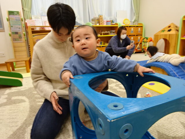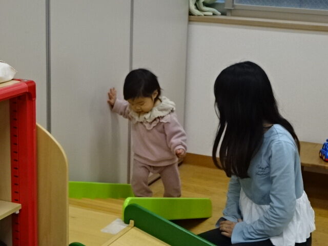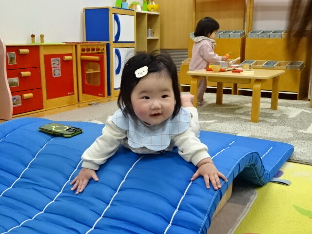 マットの山にずり這いで登ったり、ゲームボックスにつかまり立ちをしたり、すべり台をすべったりとそれぞれ好きな遊びを楽しんでいましたよ。