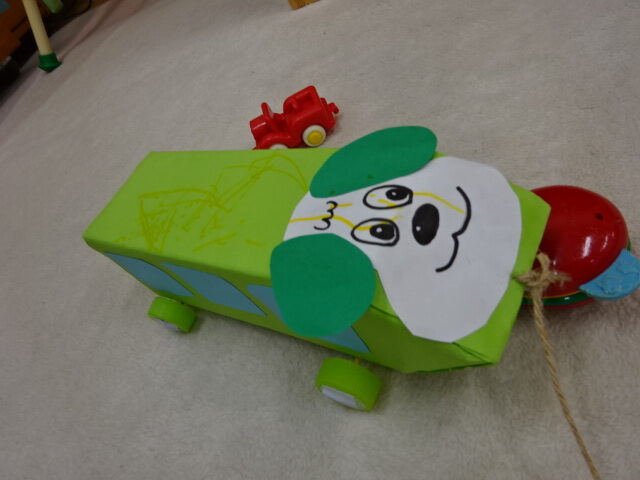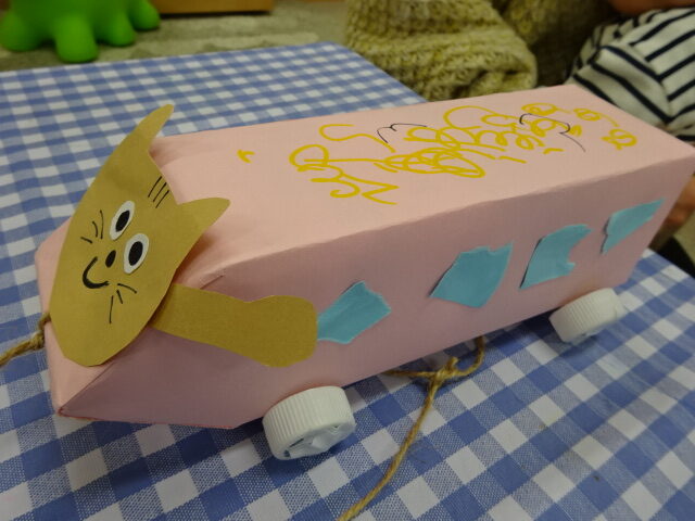 今日は牛乳パックを使った、ひもを引っ張ってお散歩できる車を作りました。