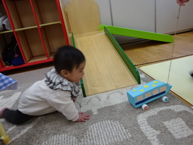 完成した作品のひもをママが引っ張ると、ハイハイで一生懸命追いかけて楽しんでいました(#^^#)
