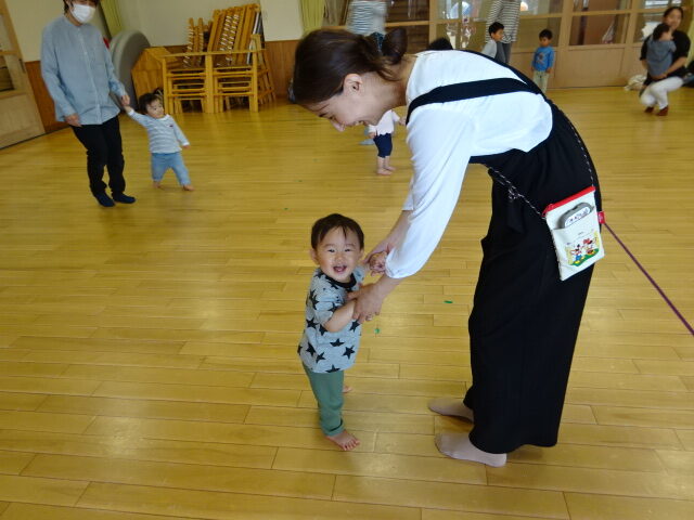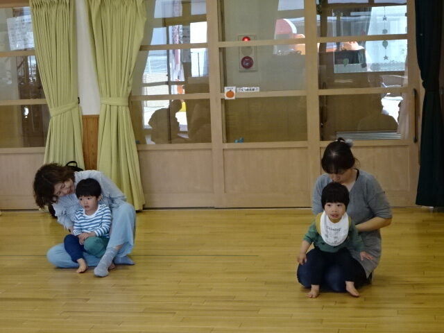 今回はリトミックの導入ということで音楽に合わせて親子で身体を動かしたりふれあい遊びをしたりして楽しみました♪