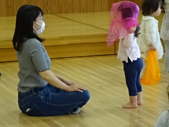 後半はスカーフを使ったリトミック!スカーフは半透明でまわりが透けて見えて安心だし、小さく丸めたり、ゆらゆら揺らしたりと様々な遊び方ができます。