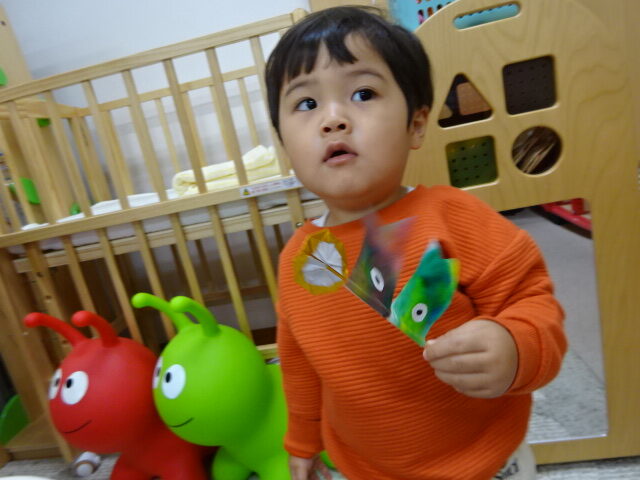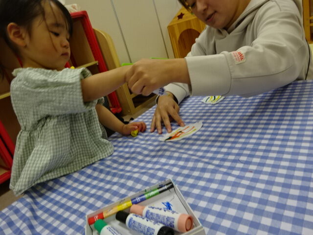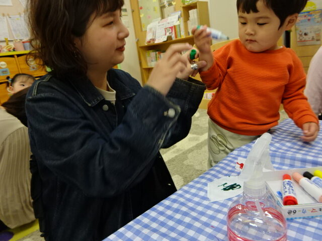 親子でペンで色を塗ったり、霧吹きで水をかけたりしていました。