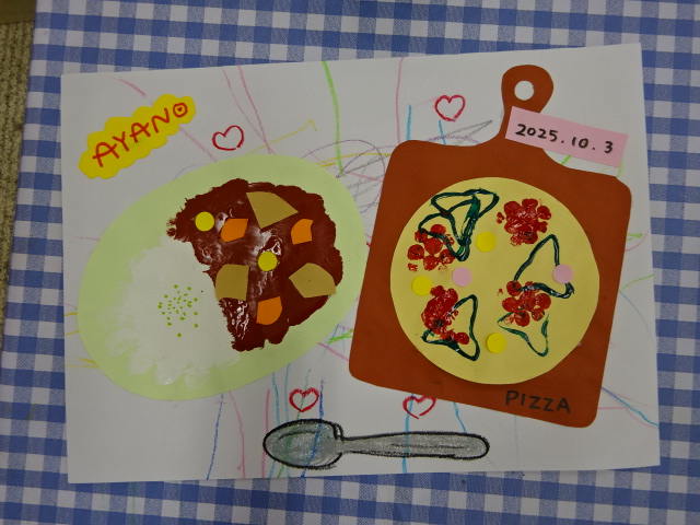 今日は絵の具遊びの日でした。スタンプや筆でピザとカレーを製作しました。 最初はおそるおそる触っていた...