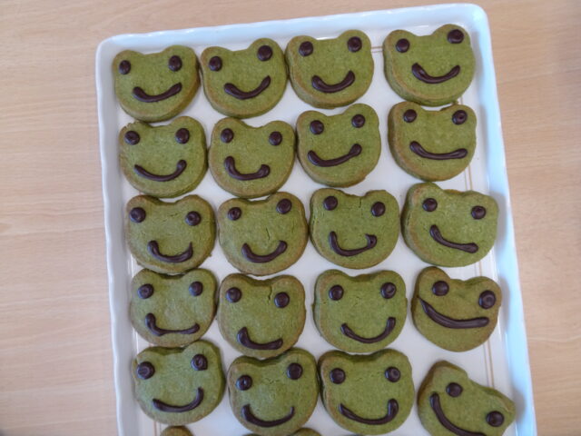 今日のおやつは給食先生手作りのカエルのクッキー!