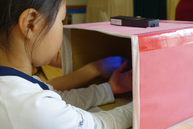手洗いの後はブラックライトで汚れの落ち具合を確認しました。