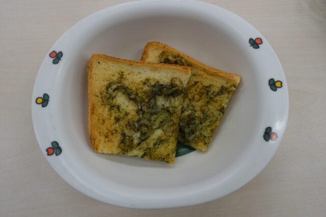 未来の給食週間として、今日のおやつはすじあおのりのトーストが提供されました。