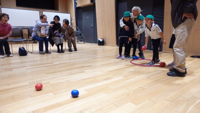 市の生涯学習課から老人会の皆様と一緒にボッチャでの交流会に招待され年長さんが参加してました。